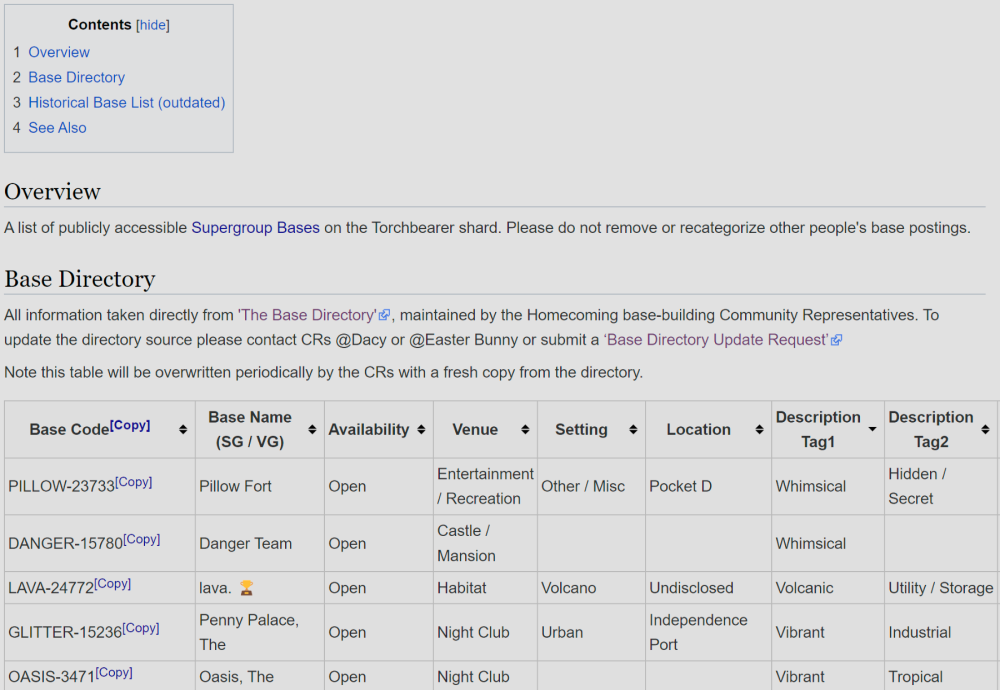 Thank you, Jimmy! I came here to mention what a pleasant surprise it was to find SG Base items included in the release. My heart sank a bit at first glance when I thought there weren’t any! Thanks for the invitation to include pictures. I love the suggestion of an expandable list of content headings or a TOC post that links to detail sections. I play the game a lot for immersion in the theme and the bases are such a delight to aid the belief in the character. I have seen the base building facilities in some other games and they pale into insignificance against the tools that Homecoming provided when they added the extra controls to the base editor. The works of art that have been created (despite the limitations of the underlying editor) are so amazing that they create a serious thirst for additional capabilities. Such artistry deserves support. Thank you a million times over. Keep up the amazing work!