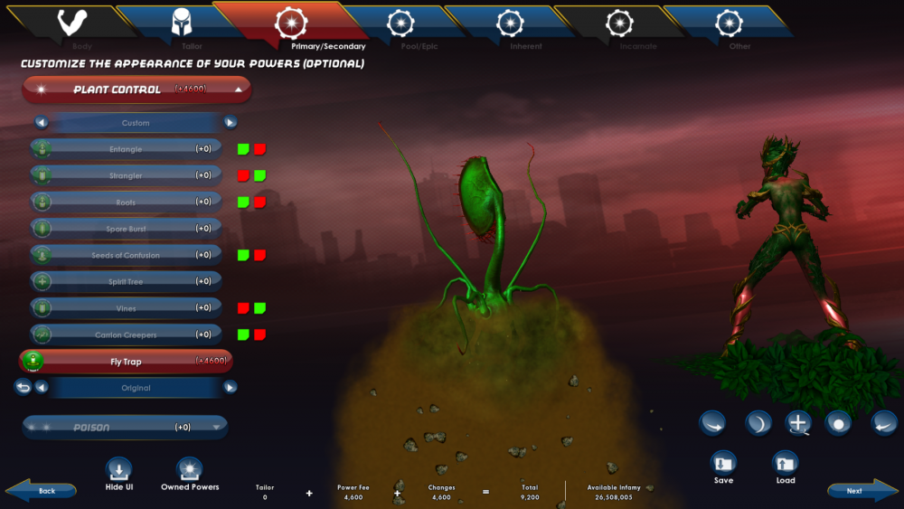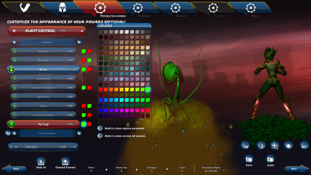 If you change the Fly Trap customization to color tintable, then go back to original, it doesn't go back to the original colors. It keeps whatever you set in tintable. It also applies this change across ALL costumes, even ones that still had Fly Trap set as original and never changed it, though it doesn't look like it's still the original colors in the costume creator. Case in point. No change after switching back to original. This lack of change applies in game as well. After checking out of the tailor with the color set to original, and I respawn the Fly Trap, it's still the more vibrant green. Can post the other half of the issue in a reply.