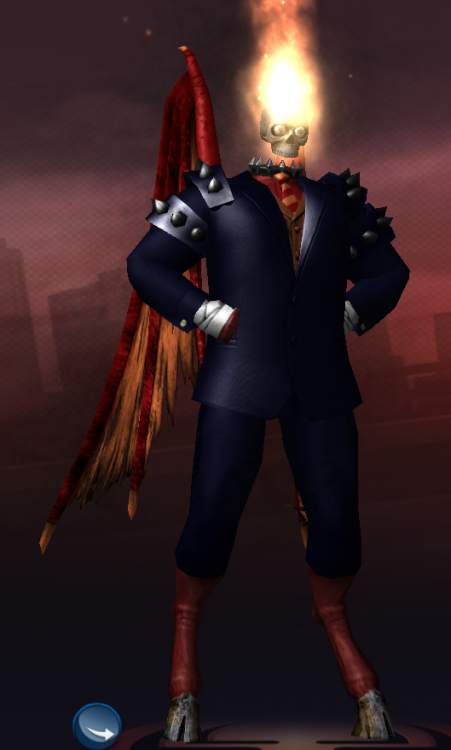So I have not got my main up to max level yet, but I went back an made my old flying assault rifle blaster. While I was faffing with character options he ended up a little different from before... What happens when you cross the mafia and the legions of hell? That's not the opening line of a joke, as Donny 'Don' Morningstar found out to his cost. Once a rising star in one of the many branching crime families, Don was on the way to make a name for himself. He was charming when he needed to be, conniving and slippery to just the right degree, and a ruthless killer when asked. His superiors had him marked down for great things, and the brash young man strutted the streets of the city with confidence and pride. But, one day, it was discovered that there was a rat in the house, and Don found himself unknowingly the lead suspect. He was, of course, innocent of this particular crime. However, climbing the ladder of success had seen him make few friends and many enemies. Called to a dockside warehouse, he was surprised to see his Capo waiting with a squad of enforcers. The man shook Don by the hand, thanked him for all his hard work, then stepped back to let his men riddle Don with bullets. Slumping the the cold concrete, Don's last thoughts were a mixture of confusion and anger. Obviously there were no pearly gates waiting to open for the lifelong criminal. Down to hell he went, to be tormented with all the other damned souls. But Donny was not without vision and drive. Those qualities were, however, lacking in the devil overseeing the sinners in his particular section of the pit. Vzz'guoth - Devouter of the Iniquitous - was bored with his eternal duties and the politics of hell. He was at first furious when the bleeding and bloody figure of Donny crawled into his throneroom of petrified bone, but was amused when the human pointed out ways to make the punishments meted out more effective and efficient. He made Don first his pet, and then later his adviser. After all, letting the human take over his duties meant that he could concentrate on his own depraved pastimes. Don managed, with guile and not a little violence, to carve out his own little kingdom within Vzz'guoth's domain. Obviously the demons of the pit were reluctant to follow his directives, until his master punished them appropriately. But in the end they just started doing what they were told just to get it over with. Donny sipped blood from skulls and lounged on living pillows of screaming skin while others around him suffered. He thought he had, once again, found the good life he felt he deserved. It did not take too long for his activities to be discovered. Arch-devils raided Vzz'guoth's realm and dragged both him and Donny before infernal courts to answer for their various crimes. Donny was, as a prelude to his final punishment, flayed by inches from the feet up until only his head remained to plead for mercy. And plead he did. In the end, fearing final, total death at the hands of his captors, he pinned all the outrages he had committed on Vzz'gutoh. The devils laughed, not believing him for a second. But his cowardly display did entertain them. In the end they passed judgement on the pair. Vzz'guoth was decapitated, and Donny's flaming skull was placed on the stump, creating a hybrid being. Don Mornigstar was now neither human nor devil, and for his crimes he was trusted by nobody. His eternal penance is to act as a herald of the damned, answering the summons of mortals who would trade their souls for power. He can, himself, never claim these souls and must take them to his betters. Thus he gets to tread the richest palaces of Hell, carrying a fortune in human souls, but own and enjoy none of it. Currently he has been able to break this cycle for a time. A human who summoned him had a heart attack upon seeing him appear. As he was not able to sign the contract to pledge his soul to hell, Don does not have to return with it. He has been desperately seeking a way to anchor himself to the mortal world to try, once again, to cheat his masters and find a way to the life he believes he is owed.
