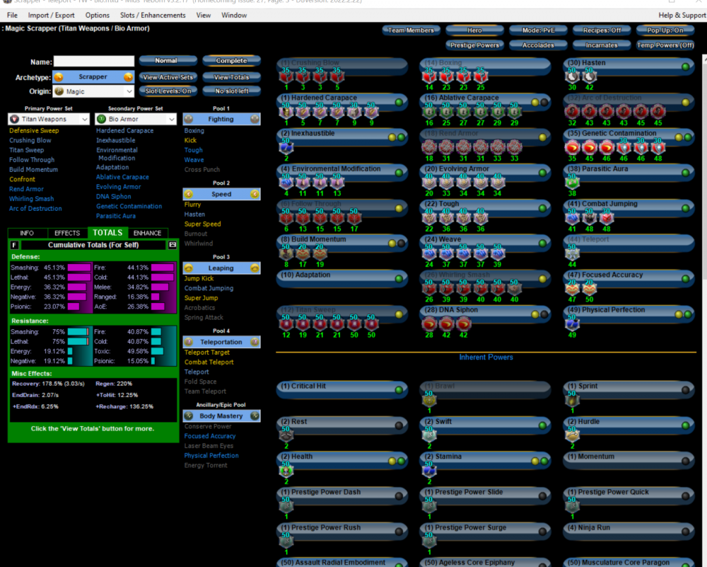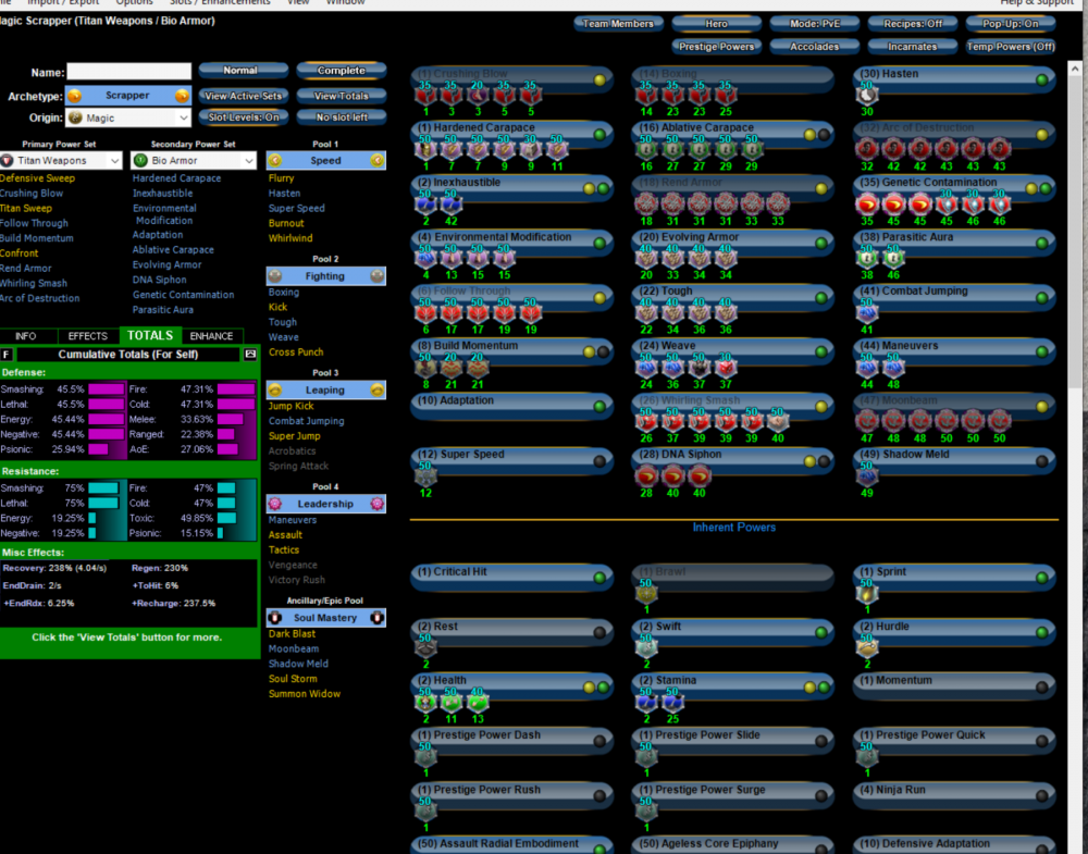 Here's one that is softcapped to SLFCEN. Having defenses up for most damage types makes it incredibly survivable This Hero build was built using Mids Reborn 3.1.2.5 https://github.com/LoadedCamel/MidsReborn Click this DataLink to open the build! Level 50 Magic Scrapper Primary Power Set: Energy Melee Secondary Power Set: Bio Armor Power Pool: Speed Power Pool: Fighting Power Pool: Leaping Power Pool: Leadership Ancillary Pool: Soul Mastery Hero Profile: Level 1: Energy Punch -- KntCmb-Acc/Dmg(A), KntCmb-Dmg/Rchg(7), KntCmb-Dmg/EndRdx/Rchg(11), KntCmb-Dmg/EndRdx(29) Level 1: Hardened Carapace -- GldArm-3defTpProc(A), UnbGrd-Max HP%(3), UnbGrd-ResDam/EndRdx/Rchg(3), UnbGrd-ResDam(5), StdPrt-ResDam/Def+(23), UnbGrd-Rchg/ResDam(36) Level 2: Inexhaustible -- PrfShf-End%(A) Level 4: Environmental Modification -- LucoftheG-Def/Rchg+(A), Rct-Def/EndRdx(5), Rct-Def(11), Rct-ResDam%(13), Ksm-ToHit+(27), ShlWal-ResDam/Re TP(27) Level 6: Build Up -- RctRtc-ToHit/Rchg(A), RctRtc-ToHit(7) Level 8: Bone Smasher -- SprBlsCol-Rchg/HoldProc(A), SprBlsCol-Acc/Dmg(9), SprBlsCol-Dmg/EndRdx(9), SprBlsCol-Dmg/EndRdx/Acc/Rchg(13), SprBlsCol-Acc/Dmg/Rchg(15), SprBlsCol-Acc/Dmg/EndRdx(34) Level 10: Adaptation Level 12: Super Speed -- Qck-EndRdx/RunSpd(A) Level 14: Boxing -- KntCmb-Acc/Dmg(A), KntCmb-Dmg/EndRdx(15), KntCmb-Dmg/Rchg(21), KntCmb-Dmg/EndRdx/Rchg(21) Level 16: Ablative Carapace -- Prv-Heal(A), Prv-EndRdx/Rchg(17), Prv-Heal/EndRdx(17), Prv-Absorb%(19), Prv-Heal/Rchg(25), Prv-Heal/Rchg/EndRdx(33) Level 18: Whirling Hands -- Arm-Dam%(A), Arm-Dmg(19), Arm-Dmg/Rchg(37), Arm-Acc/Dmg/Rchg(37), Arm-Acc/Rchg(37), FuroftheG-ResDeb%(39) Level 20: Evolving Armor -- RctArm-ResDam(A), RctArm-ResDam/EndRdx/Rchg(23), RctArm-ResDam/EndRdx(29), RctArm-ResDam/Rchg(33) Level 22: Tough -- RctArm-ResDam/EndRdx/Rchg(A), RctArm-ResDam/Rchg(31), RctArm-ResDam(31), RctArm-ResDam/EndRdx(33) Level 24: Weave -- LucoftheG-Def/Rchg+(A), LucoftheG-Def(25) Level 26: Total Focus -- Hct-Dam%(A), Mk'Bit-Dam%(34), Hct-Dmg(39), Hct-Dmg/Rchg(39), Hct-Acc/Dmg/Rchg(40), Hct-Acc/Rchg(40) Level 28: DNA Siphon -- SprScrStr-Acc/Dmg/Rchg(A), SprScrStr-Rchg/+Crit(31), SprScrStr-Acc/Dmg/EndRdx/Rchg(34) Level 30: Hasten -- RechRdx-I(A), RechRdx-I(36) Level 32: Energy Transfer -- SprCrtStr-Acc/Dmg(A), SprCrtStr-Dmg/Rchg(42), SprCrtStr-Acc/Dmg/Rchg(43), SprCrtStr-Dmg/EndRdx/Rchg(43), SprCrtStr-Acc/Dmg/EndRdx/Rchg(43), SprCrtStr-Rchg/+50% Crit(45) Level 35: Genetic Contamination -- SprScrStr-Acc/Dmg(A), SprScrStr-Dmg/Rchg(36), Erd-Acc/Dmg/Rchg(40), SprScrStr-Dmg/EndRdx/Rchg(42), Erd-%Dam(42), Erd-Acc/Dmg/EndRdx/Rchg(48) Level 38: Parasitic Aura -- Pnc-Heal(A), Pnc-Heal/EndRedux(45), Pnc-EndRdx/Rchg(45), Pnc-Heal/Rchg(50), Pnc-Heal/EndRedux/Rchg(50) Level 41: Combat Jumping -- LucoftheG-Def/Rchg+(A) Level 44: Maneuvers -- LucoftheG-Def/Rchg+(A), LucoftheG-Def(48) Level 47: Moonbeam -- SprWntBit-Rchg/SlowProc(A), SprWntBit-Dmg/EndRdx/Acc/Rchg(46), SprWntBit-Dmg/Rchg(46), SprWntBit-Acc/Dmg(46), SprWntBit-Acc/Dmg/EndRdx(48), SprWntBit-Acc/Dmg/Rchg(50) Level 49: Shadow Meld -- LucoftheG-Def/Rchg+(A) Level 1: Critical Hit Level 1: Brawl -- Acc-I(A) Level 1: Sprint -- Clr-Stlth(A) Level 2: Rest -- IntRdx-I(A) Level 2: Swift -- Run-I(A) Level 2: Hurdle -- Jump-I(A) Level 2: Health -- Pnc-Heal/+End(A) Level 2: Stamina -- PrfShf-End%(A) Level 1: Energy Focus Level 12: Speed Phase Level 49: Quick Form Level 1: Prestige Power Dash -- Run-I(A) Level 1: Prestige Power Slide -- Run-I(A) Level 1: Prestige Power Quick -- Run-I(A) Level 1: Prestige Power Rush -- Run-I(A) Level 1: Prestige Power Surge -- Run-I(A) Level 4: Ninja Run Level 50: Assault Radial Embodiment Level 50: Ageless Core Epiphany Level 50: Agility Radial Paragon Level 10: Defensive Adaptation Level 10: Efficient Adaptation Level 10: Offensive Adaptation ------------