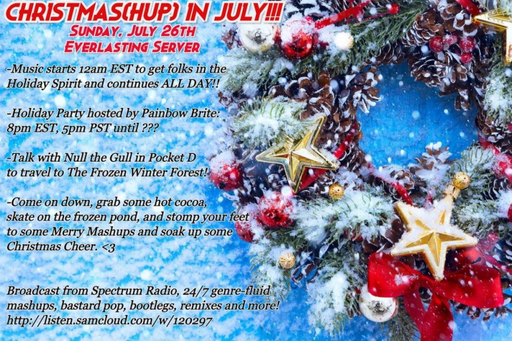 Sunday July 26th - Everlasting Server -It's CHRISTMAS(Hup) In July!! Who's been Naughty and who's been Nice? It doesn't matter because everyone gets the gift of MUSIC!! -Christmas Music starting at 12am EST July 26th, and playing ALL. DAY. LONG. On Spectrum Radio! http://listen.samcloud.com/w/120297 -Christmas Party starting at 8pm EST/5pm PST until ??? hosted by Painbow Brite at the Frozen Winter Forest!! talk with Null the Gull in Pocket D to get there Come on down, grab some hot cocoa, skate on the frozen pond, and stomp your feet to some Merry Mashups. Hope to see you there! ❤️❤️