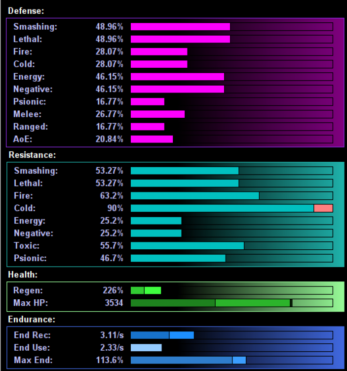 Hi folks, Working on a Ice/Spines tanker. So far, he's at lv 21 and has been an absolute blast. I have zero idea of what to do with Spines. Or in general. The character came out of a concept of trying to combine -rech and +regen. Are there any recommendations you might make? Build: | Copy & Paste this data into Mids Reborn : Hero Designer to view the build | |-------------------------------------------------------------------| |MxDz;1390;694;1388;HEX;| |78DA6593594F135114C7EF74A642A195A52C656FCB524A612804F44DA38206A4090| |9C437D3D472AD13EB4C332D093E9AB87E025FC4E54D4DF4C107048C1FC0252E2FAE| |0FBEE2C2A27E807A3AFF136CC2A4EDEFCEFFDE73CFFF9E7B9A589AF03E3E71E9B05| |0BCC7B2A97C3E399F32CF4BDB9D48658CB4A0C7376F2D19E9E0A4B160652DB38294| |00962427E45969E6A53E9596C923F605CBF6F3444266A5D4E7728629F3A27ED6B2B| |2FA3C4939CB2EA40A8665FA1CE9B891395730CC4C95F336979372C1EB0C67648A42| |33CD933923AD1FB5170B3239672D66938954BE20ED8B01B2D04DDF171EFA514A168| |B8A68A4C188265C0DE04A6477CE2DFA5C8E561901ABFA9951B07600EC8981AF685F| |05B19A6242EBB39836330F469E20DF2AE553399F7A597334ED0AF32AB8EF1AF33A5| |879037C4DF9DC8815EE90C0FE54E70AD62A9629975F136B94C3034DF5B0AF488EC9| |BEA2ECEB0DED59CD7EAA3FA88EE6FDC8FC04EEFFCCFC02D67E052394DB2790DBD70| |64D6D12A286B59A56787C4B39EA90C355C7F5AFE7FAD7D7822F698D9F7DF837B057| |C377E60FB0E927F31718DC0415F2D1C8391B8BF408959466DEADB934E8D0446014A| |B03517A8F68A2731C993BE360700C7C474E5A9C6B2DBA5BB610D3BAAD3A956DDDC1| |7BFB6FE61FB0F32FA851DE36EE88363E69F024E642D3CCE3607C0A0C534C0777674| |7AC54318F0831DF93972EBEDDAE4338C773BADD309F2D7C0B9DD1BDCCBCCDBC03F6| |DC65DE03D394B297637B375CCE7E4323E8047D107EF4FB583BFC90F908FCE615A29| |F63FB57B88B9E3257C18135E63AF3192869EB18C7C646A10D8E31C79907C0A183CC| |30FCACD37975BE5DFD01E69AA86671AE4B9CEBDCAE097E8AF429754154DBFD6F176| |7F6CCCE6A3C498AE2289B55BBEB79CDF67FC52542F0337C0AF9E2D3E8A3AD3D513B| |E5CA4D383E4DDA087B49958DCF948D67CBC6FF0049F6DD48| |-------------------------------------------------------------------| With 1 target for Energy Absorption & No Incarnates but does have the +res procced: Please let me know your thoughts!!