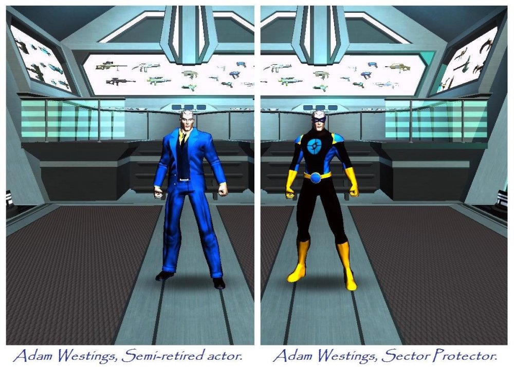 Sector Protector is the weird one, he started off as a City of Heroes character on Pinnacle named Crystal Crusader, but gave up the name so that the super group could be called Crystal Crusaders. The group itself was a play on the Green Lantern Corps and needed a proper name and as I had just gotten rid of a hero named Sector Protector, I took that name for this hero. The one thing he always was though was a tribute to Adam West (Adam Westings in game). I played him till closure but never really offered up any artwork through him till I remade him in Champions. His RP Lottery hook was already in place though as it fit so well with his original CoH Bio. crusaderea5: Sector1: The reasons for posting these two pics is simply because the majority of the Sector Protector lotteries were held for the Silver Age Sentinels in Champions and on the official Champions forums and his costume looks a little different because of it. I won't post any of the CO lottery winners pics unless they directly involve Adam himself. SAS-01: AC -