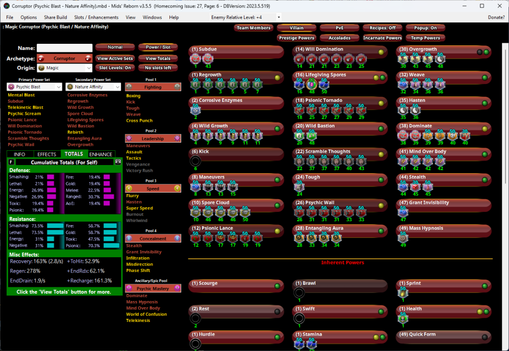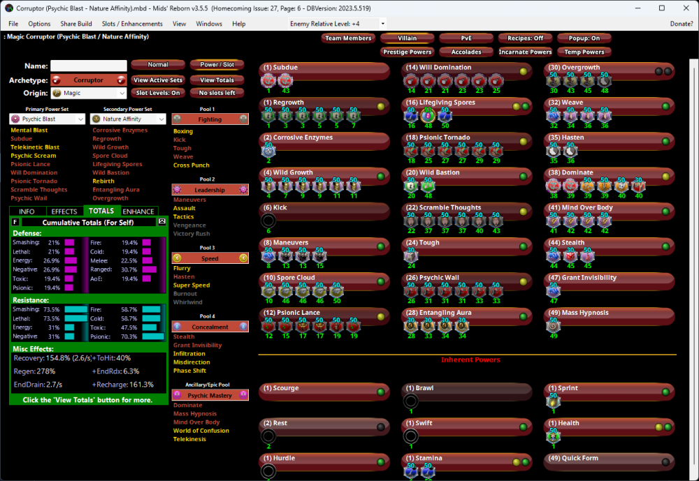 21. Finally, for those of you wondering what it looks like as a Defender... (Note: Power order was done quickly to see the comparison) vs, a corrupter Solo they will do about the same damage with the Corrupter pulling ahead by a couple percent due to scourge. The Defender will provide better buffs which looks something like this: To teams you provide: 23.63% resistance to all damage5.4% Defense17% To hit bonus82.5% Damage buff74.5% Endurance discountand if you drop spores on someone, some light healing and end gain. I'd probably go Defender with this character as I don't see a ton of need for the corruptors advantages. The Corrupter will do more AOE on a team, but ST is pretty much a wash with the defender doing better solo. DPS Defender (Team / Solo) Will Dom - 182.6 / 201.9 DPS Lance - 330.2 / 349 DPS Dom - 282.4 / 292.2 DPS Tornado - 61.8 / 68.3 DPS Wail - 212.5 / 234.6 DPS DPS Corrupter (Note: This does not account for scourge which can add about 15-18% average total damage on hard targets) Wil Dom - 207.2 DPS Lance - 343.5 DPS Dom - 288.4 DPS Tornado - 67 DPS Wail - 230 DPS