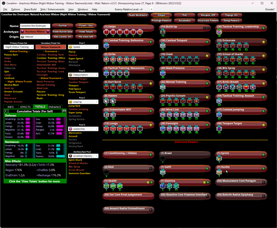 17. If you ever have been sitting around thinking, "Why did Cones go out in the 80's?" Or better yet, "How can I make a character with most of their attacks greater than 2 seconds?" then this is the thread for you. Homecoming, I present you, ConeAnn The Destroyer! What is this? If you clicked on this title hoping for some sage build advice and puns... well you've mostly come to the right place then! Maybe not quite as much on the sage advice, but certainly on the puns and concept! I often like to tinker with builds and have hundreds on the Beta server. I don't post very often because most of the time other people have likely done the concept and probably better. Still, I do a lot of, "this probably won't work" builds, and usually they don't. But sometimes... just sometimes... they surprise you. Before I get into the details, let's lay out expectations. This is probably NOT the best Widow design you can make. However, if you are looking for a mid ranged puncher who sprays AOE like a "Material Girl" using a credit card on a shopping spree, then this might just be for you. The Concept The concept was simple, what would be an effective character who has maximum cone use? The Solution Night Widow. It would work with Fort as well, but I wanted to keep it simple and the extra recharge that Widows get helps the build work. While Night Widow only has 2 native cones, and power sets like Dark Blast smirk with their three... if you add in the Leviathan epic, you get access to three additional cones. These cones are all 30 degree arcs and not like some of the narrow abominations that AR or Dark get! The second thing to note is that not only does it add three cones, but two of them proc VERY well. Which is why this build worked out far better than I expected. Add that to the Global Unique Superior Spider's Bite for another bite at the proc barrel (only 12%) and you have a lot of cones doing a lot of damage. Finally, you have all of the goodness of Widows. Mobile. High defense. Good survivability. High damage. Stealth. Like many builds I try, I always look to see who has done one first... and perhaps often times better. In this case, I couldn't find one that matched what I was looking for. People seemed to care about utility or survivability, or some crazy concept called a Fortunata... The Build View This Build In MRB Build Notes: Cone Proc Rates: Bile Spray - 88% @ 3 Procs + 12.5% res debuff Arctic Breath - 88% @ 5 procs + 20% res debuff School of Sharks - 62% @ 4 procs + 12.5% res debuff Psychic Scream - 47% @ 3 Procs + 12.5% res debuff Dart Burst - 28% @ 3 procs That's a lot of procs, and they go off... A LOT! Twelve of them in seven seconds at over a 60% rate, averaging 70+% rate. If you wanted to tinker, you could remove one of the 12.5% procs, probably in school of sharks and replace it with another damage IO/proc since you're likely applying the 12.5% res debuff already. Without incarnates or counting the RES procs, the AOE chain averages over 100dps, which is enough to technically burn down an AV (95 dps overcomes regen). Mind you, I wouldn't want to do this, your ST chain is SOOOO much better for hard targets. Still, it's nice to know that you could do it if you wanted. You have full stealth: If you are sprinting, you have the celerity and mask presence going off and you can stealth just about anything. This makes setting up positions very easy. Mind Link is permanent without Hasten: I like hasten for the cone chain. But with five of them, should you decide to get rid of it, you can and Mind Link will still be up with five seconds to spare. That would let you take fold space, or some other fun power. Even without Mind Link, you still have decent defenses, sitting at 30-40% for every position. I mean I have never said, "If You Forget Me" while in a Task Force and missing that Mind Link was sitting there, unused and "Waiting". (Note: I lied. This happens all the time.) Range: All of the cones have enhanced range. I have played around with subbing out some of the Posi's for Detonation Damage/Range. It makes the cones practically ranged attacks with some topping 80ft. You can hit a lot at that range with a 30 degree arc. I find that if I sit about 30 feet away from the mobs, I get a good combination of mobs hit. Incarnates: The choices are pretty straightforward. Musculature Core Paragon for the Alpha. You don't need End and more damage is always useful. Ion, or which ever AOE you want. Reactive for the -RES proc. Since you're a proc build, you leverage -RES far more than other toons. This is a must. Rebirth Radial for a nice heal and boosted regen. This gives some sustain you are lacking when you do get hit. Swap barrier for hard run. Assault Radial for the double hits. Great for when you want to burn down a EB or AV. Exemplar: You have a decent ST chain available as low as 13. Anything in the 30s will be totally fine. Ran a Citadel and felt like I was pulling my weight in a way that I just didn't on lots of other builds. You still have three AOEs which cycle quickly and defenses to wander around without too much worry from 21 and up. Shakrnado: Yes... I know that I am mixing references in a Madonna post with Sharknado. However, I do have to say that this build allows you to target a mob that's above you and the animation has flying sharks. If that is not a reason to play this, nothing else I can say will sway you! Notes on Playing The nice thing about a Widow build is that you have some space to do different things. This build has a 5 power ST chain (of which you only need 4) and a 5 power AOE chain along with capped defenses. The play style is to stealth your way up to a mob, position for maximum carnage and then open up with Cones of Destruction casting them "Over and Over"! I always lead with School of Sharks. Not only does it proc very well, but it keeps people bunched up for the remaining cones to unleash on them! Combat Teleport is great as a melee user, but what about ConeAnn? Well these 