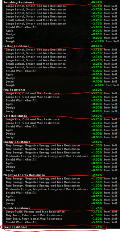 Sure, no problem. Out of curiosity, do you primarily solo or play in groups, or do you more or less do a mix of the two? A good group can cover for a lot of deficiencies that a particular character might have. My own StJ/SR Scrapper I typically run at +4/1 or +4/2. He can +4/8 some content, but he has to be VERY cautious and use a lot of hit and run tactics. In groups, I have essentially no trouble running +4/8 content. With regard to resist, you can probably improve it some, but with a SR character there may be a limit to what you can achieve. Your resists are actually all better than mine, at the present. As an example, my defenses and resists presently look like this: As you can see, my Resists are generally much lower than yours and my Defenses considerably higher. I will typically gobble one defense and one resist inspiration before jumping into combat. In groups, I always try to let any tanks or brutes advance first and draw aggro. This is also extremely helpful to survival. When Soloing, I will approach by stealth, fire build up, then combat teleport to the enemy and hit them with a crushing uppercut, followed by a spinning strike. If I get in trouble, I combat teleport out and run away with super speed to regroup and rest, rinse and repeat. I did forget to address your comment about powers. I would HIGHLY recommend trading teleport target for combat teleport and setting up macros for CT, assuming that doesn't mess with your concept too much. CT is one of the most useful powers in the game for melee AT's. I did not take either confront or elude so, yes, I would recommend you switch them up for something more useful. Conserve Power and Physical Perfection, from the Body Ancillary Pool, would be good choices to address your endurance issues (I plan to respec into them, myself, for just this purpose. Just having trouble figuring out what to give up in order to take them. lol).