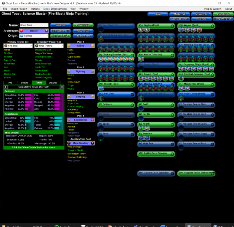 I have one. I love it. I went for high def from set bonuses. Hero Plan by Mids' Hero Designer 1.962 http://www.cohplanner.com/ Click this DataLink to open the build! Ghost Toast: Level 50 Science Blaster Primary Power Set: Fire Blast Secondary Power Set: Ninja Training Power Pool: Speed Power Pool: Fighting Power Pool: Leaping Power Pool: Leadership Ancillary Pool: Mace Mastery Hero Profile: Level 1: Fire Blast -- Empty(A) Level 1: Immobilizing Dart -- TraoftheH-Acc/Rchg(A) Level 2: Fire Ball -- SprFrzBls-Acc/Dmg(A), SprFrzBls-Dmg/EndRdx(3), SprFrzBls-Acc/Dmg/EndRdx(3), SprFrzBls-Acc/Dmg/Rchg(5), SprFrzBls-Dmg/EndRdx/Acc/Rchg(5), SprFrzBls-Rchg/ImmobProc(7) Level 4: Choking Powder -- SprEnt-Acc/Hold(A), SprEnt-Hold/Rchg(19), SprEnt-End/Rchg(29), SprEnt-Acc/Hold/End(45), SprEnt-Acc/Hold/End/Rchg(50), SprEnt-Rchg/AbsorbProc(50) Level 6: Rain of Fire -- SprBlsWrt-Acc/Dmg(A), SprBlsWrt-Dmg/Rchg(9), SprBlsWrt-Acc/Dmg/Rchg(11), SprBlsWrt-Acc/Dmg/EndRdx(11), SprBlsWrt-Acc/Dmg/EndRdx/Rchg(13), SprBlsWrt-Rchg/Dmg%(13) Level 8: Fire Breath -- Rgn-Dmg(A), Rgn-Dmg/Rchg(15), Rgn-Acc/Dmg/Rchg(15), Rgn-Acc/Rchg(17), Rgn-Dmg/EndRdx(17), Rgn-Knock%(19) Level 10: Shinobi -- LucoftheG-Rchg+(A) Level 12: Aim -- RechRdx-I(A) Level 14: Hasten -- RechRdx-I(A), RechRdx-I(21) Level 16: The Lotus Drops -- SprAvl-Acc/Dmg(A), SprAvl-Dmg/EndRdx(21), SprAvl-Acc/Dmg/EndRdx(23), SprAvl-Acc/Dmg/Rchg(23), SprAvl-Acc/Dmg/EndRdx/Rchg(27), SprAvl-Rchg/KDProc(29) Level 18: Blaze -- SprWntBit-Acc/Dmg(A), SprWntBit-Dmg/Rchg(34), SprWntBit-Acc/Dmg/EndRdx(36), SprWntBit-Acc/Dmg/Rchg(36), SprWntBit-Dmg/EndRdx/Acc/Rchg(36), SprWntBit-Rchg/SlowProc(37) Level 20: Kuji-In Toh -- StdPrt-ResDam/Def+(A) Level 22: Boxing -- Empty(A) Level 24: Tough -- GldArm-3defTpProc(A), UnbGrd-ResDam(25), UnbGrd-ResDam/EndRdx(25), UnbGrd-ResDam/EndRdx/Rchg(27), UnbGrd-EndRdx/Rchg(48), UnbGrd-Max HP%(48) Level 26: Blazing Bolt -- SprDfnBrr-Acc/Dmg(A), SprDfnBrr-Dmg/Rchg(37), SprDfnBrr-Acc/Dmg/Rchg(37), SprDfnBrr-Acc/Dmg/EndRdx(39), SprDfnBrr-Acc/Dmg/EndRdx/Rchg(39), SprDfnBrr-Rchg/+Status Protect(39) Level 28: Smoke Flash -- RechRdx-I(A) Level 30: Weave -- LucoftheG-Rchg+(A), Rct-Def/EndRdx(31), Rct-Def/EndRdx/Rchg(31), Ksm-ToHit+(31) Level 32: Inferno -- Obl-Dmg(A), Obl-Acc/Rchg(33), Obl-Dmg/Rchg(33), Obl-Acc/Dmg/Rchg(33), Obl-Acc/Dmg/EndRdx/Rchg(34), Obl-%Dam(34) Level 35: Blinding Powder -- CrcPrs-Conf(A), CrcPrs-Conf/Rchg(45), CrcPrs-Acc/Conf/Rchg(46), CrcPrs-Acc/Rchg(46), CrcPrs-Conf/EndRdx(46), CrcPrs-Conf%(48) Level 38: Golden Dragonfly -- Obl-Dmg(A), Obl-Acc/Rchg(40), Obl-Dmg/Rchg(40), Obl-Acc/Dmg/Rchg(40), Obl-Acc/Dmg/EndRdx/Rchg(43), Obl-%Dam(45) Level 41: Scorpion Shield -- Rct-Def(A), Rct-Def/EndRdx(42), Rct-EndRdx/Rchg(42), Rct-Def/Rchg(42), Rct-Def/EndRdx/Rchg(43), Rct-ResDam%(43) Level 44: Combat Jumping -- ShlWal-ResDam/Re TP(A) Level 47: Maneuvers -- Rct-Def/EndRdx(A), Rct-Def/EndRdx/Rchg(50) Level 49: Super Jump -- BlsoftheZ-ResKB(A) Level 1: Brawl -- Empty(A) Level 1: Defiance Level 1: Prestige Power Dash -- Empty(A) Level 1: Prestige Power Slide -- Empty(A) Level 1: Prestige Power Quick -- Empty(A) Level 1: Prestige Power Rush -- Empty(A) Level 1: Prestige Power Surge -- Empty(A) Level 1: Sprint -- Empty(A) Level 2: Rest -- Empty(A) Level 4: Ninja Run Level 2: Swift -- Empty(A) Level 2: Health -- Pnc-Heal/+End(A), NmnCnv-Regen/Rcvry+(7) Level 2: Hurdle -- Empty(A) Level 2: Stamina -- PrfShf-End%(A), PrfShf-EndMod(9) Level 50: Clarion Core Epiphany Level 50: Support Radial Embodiment Level 50: Agility Core Paragon ------------