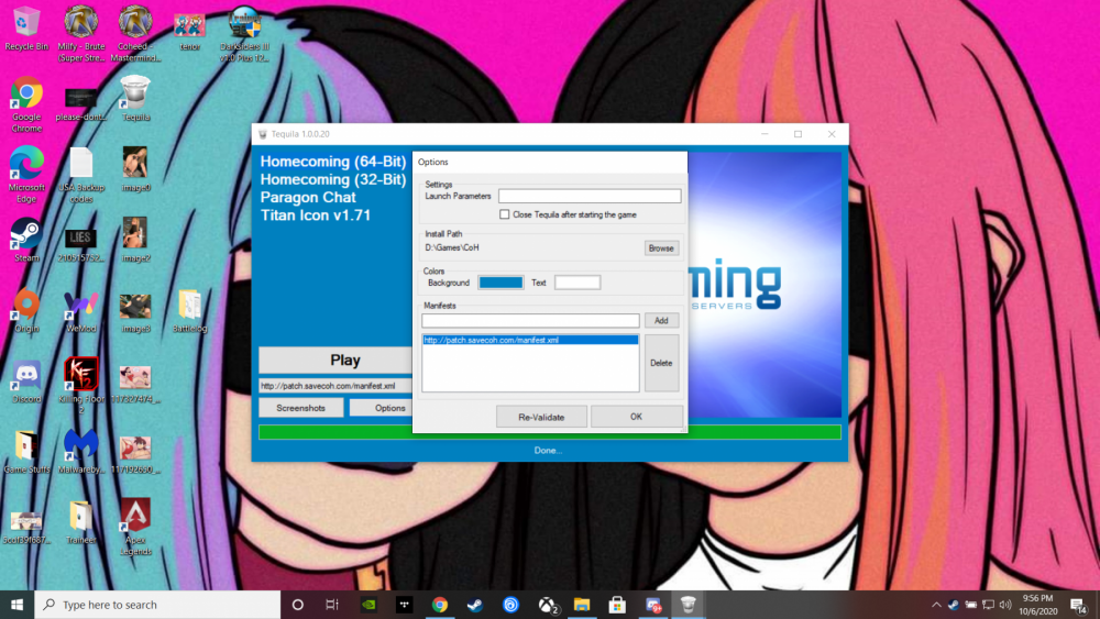 This is the second time after an update i haven't been able to connect can someone help me. All the files are in the right spot but this keeps giving me the " Wrong game version, run patcher and reconnect, server 20201124_3403, client 20201107_3213" . Ive tried patching and re-validate and nothings working. My logs: [11/24/2020 10:12:46 AM] Loading application. [11/24/2020 10:12:46 AM] Load application complete. [11/24/2020 10:12:46 AM] Started patching [11/24/2020 10:12:46 AM] Attempting to download Manifest file "http://patch.savecoh.com/manifest.xml" [11/24/2020 10:12:47 AM] Manifest downloaded successfully, starting to process it. [11/24/2020 10:12:47 AM] Starting self-patch process. [11/24/2020 10:12:47 AM] Self patching process complete. [11/24/2020 10:12:48 AM] Loading Web Browser URL to: "https://patch.savecoh.com/homecoming.html" [11/24/2020 10:12:49 AM] Finished patching. [11/24/2020 10:12:57 AM] User clicked play with the following profile: Homecoming (64-Bit) [11/24/2020 10:13:35 AM] User clicked to open Options window [11/24/2020 10:13:49 AM] User clicked to open Options window [11/24/2020 10:13:50 AM] Revalidation process started [11/24/2020 10:13:50 AM] Started patching [11/24/2020 10:13:50 AM] Attempting to download Manifest file "http://patch.savecoh.com/manifest.xml" [11/24/2020 10:13:50 AM] Manifest downloaded successfully, starting to process it. [11/24/2020 10:13:50 AM] Starting self-patch process. [11/24/2020 10:13:50 AM] Self patching process complete. [11/24/2020 10:14:46 AM] Finished patching. [11/24/2020 10:14:48 AM] User clicked play with the following profile: Homecoming (64-Bit) [11/24/2020 10:17:13 AM] User clicked to open Options window [11/24/2020 10:17:18 AM] Revalidation process started [11/24/2020 10:17:18 AM] Started patching [11/24/2020 10:17:18 AM] Attempting to download Manifest file "http://patch.savecoh.com/manifest.xml" [11/24/2020 10:17:18 AM] Manifest downloaded successfully, starting to process it. [11/24/2020 10:17:18 AM] Starting self-patch process. [11/24/2020 10:17:18 AM] Self patching process complete. [11/24/2020 10:17:30 AM] Finished patching. [11/24/2020 10:17:33 AM] User clicked play with the following profile: Homecoming (64-Bit)