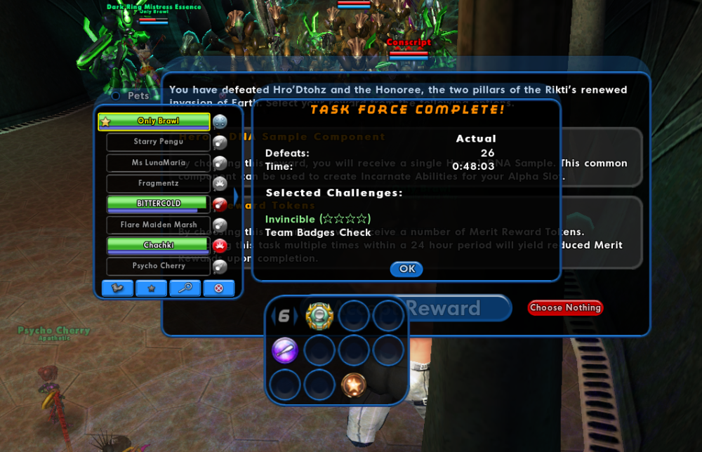 What started as a joke turned into an absolute icon in the form of Only Brawl, my new Stone Armor/Energy Melee Tanker that only uses Brawl for combat--no autopowers, no toggles, no actives. (I do use Travel Powers...I'm not a monster.) This means that every single power and slot is a set mule to empower my endless usage of Brawl, which is 6-slotted with 2 Acc/Dams and 4 procs. My first accomplishment with him was taking him on a Really Hard Way Magisterium before he had any incarnate powers. I dualboxed, played my ice/cold corruptor, gave Only Brawl a jetpack and put myself on follow with Brawl on auto. Somehow, despite no level shifts and autofire brawl, Only Brawl managed to get the killing blow on Chimera. If only you could have heard our voice chat in that moment... Since that day, I decided to step it up, finish up a few passive accolades for some bonus health, and then lead a 4-Star Lady Grey where I tanked with him. No following or dualboxing this time. I would either get this the legit way, or I wouldn't get it at all. As I thought through the TF mechanics, I realized it would be impossible to tank well without the use of Taunt, as brawl alone is not enough to control and maintain aggro on multiple high-priority threats. I also realized I would need to use Fold Space and Combat TP for effective movement. If I'm asking my team to carry me with everything else, I needed to make sure I carried out my end of the deal to tank it effectively. So, with those necessary concessions made, I gathered some friends and we set off to conquer Omega K'ong and his merry band of Rikti fodder. Not only did we pull it off, we did it in under 50 minutes with only 26 deaths, no teamwipes, and Only Brawl did not die a single time (screenshot in spoiler tag) As additional proof, I did record the run, but I accidentally screwed up my OBS settings and it did not capture the in-game audio, however I did clean up the Discord audio and kept it so all of you could experience the marvel that was the Only Brawl run, all the shot calls, and most of the jokes. Later that evening, I also tanked a 4Star Aeon, however I failed to record that one (recorded the wrong game window 😭). So now Only Brawl has legitimately earned Excalibonk and the Rikti Mobile Combat Dummy. Special thank you to StarWhispers, Chachki, Cherry, SapphireRachel, Gregg (Celestia), Cowbell, and Marsh for actually agreeing to go through with this run! But this achievement does not actually support the argument that you can bring what you want just because I showed it can be beat just using Brawl. It actually proves the opposite, as without everyone else on the team bringing mostly "meta" builds/powerset combos, this wouldn't have been possible. I don't know that this would be possible with any less meta of a setup. It's moreso proof that all of the work the dedicated hardmode community has invested in this content has been really successful. For anyone who would like to see it, I have attached the Mids build in this post. The V1 of this build that I use for normal content is less than 1% off of softcap for S/L and Melee Defense through set bonuses alone. Happy to provide that upon request if anyone would like to see it. PVE - ONLY BRAWL V2.mbd With that, enjoy the run!