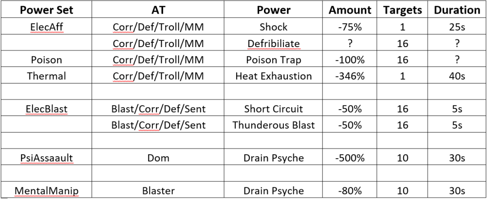 Yes. There's a post halfway down this thread that does a good job of explaining End drain/recovery and mobs. Also here's a little chart of -Recovery powers (where Defender is an AT option, I used those values). Forgive my spelling errors, typing with a cast is hard. EDIT: bah, missed Galvanic Sentinel and Discharge. Drain Psyche really is wild.