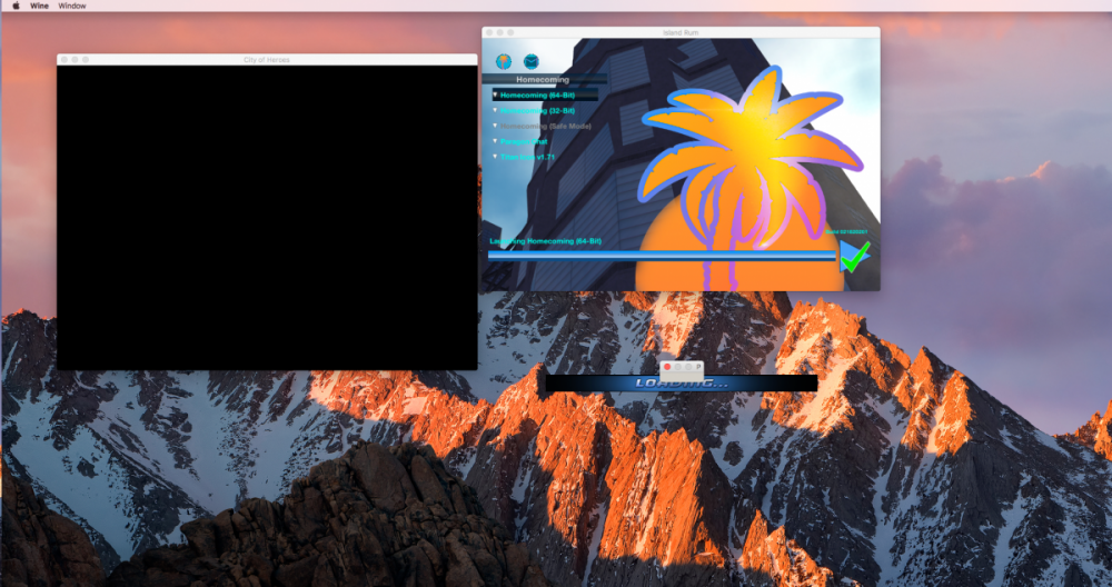 My client quit unexpectedly today. When I tried relaunching "loading" appeared then this smaller window opened (see below) along with a barely noticeable and completely redundant tab (over the loading message), which could only be closed, it allowed no further interaction. Tried relaunching, deleted and redownloaded coh folder, deleted and reinstalled island rum and the same issue persists. Has anyone seen this before or know why this could be happening? Maybe some hidden file that's been corrupted? Note, the window where it hangs is part of "wine".