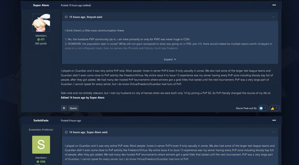 PvP was a huge part of CoH until issue 13 and even after, the most populated server (Freedom) had a huge PvP presence, the zone PvP was always huge battles. To say PvP was minuscule is a bold face lie. After issue 13 and PvPers began to quit, the playerbase suffered greatly especially on my home server of Guardian which went from a medium population server to a low population server. PvP was so prominent at the time, it was a selling point for City of Villains and its PvP zones. Even twords the end of the game, Virtue (Roleplay server) had a decent sized PvP community. It would not require "considerable resources" nor would it require the current developers who are hard at work doing PvE content to stop what they're doing. It would require the same amount of attention it current gets, I don't know if you've noticed but patch notes usually have PvP changes in them as is. So guess you better move on? Your contributions are not to the developers or their time, It's to the server cost. The developers owe you nothing and do not have to do anything you think they should or shouldn't, your entitlement is kinda disgusting TBH. -