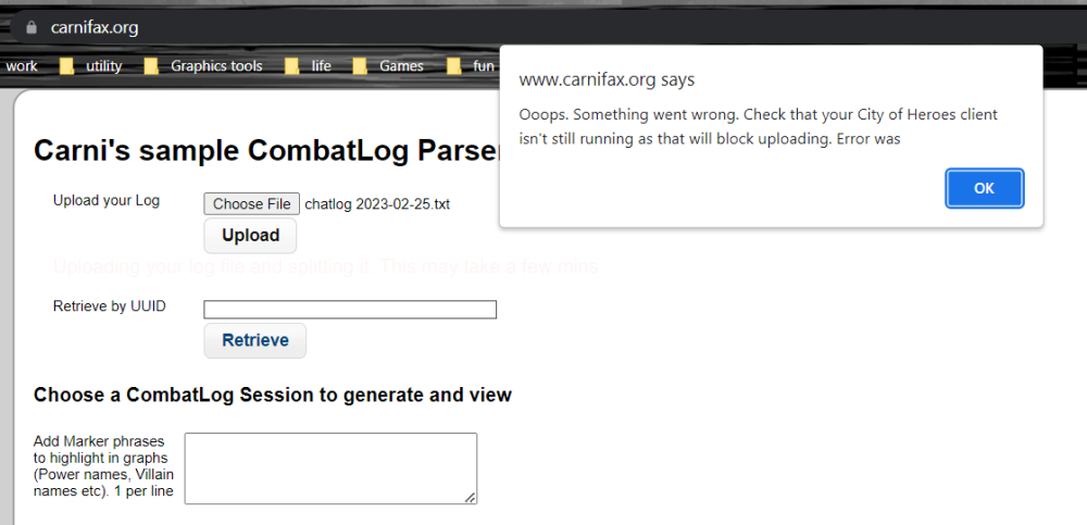 Nowadays when I load my chatlog, I get notices that I have to quit the CoH client, and I've already done that. Screenshot attached