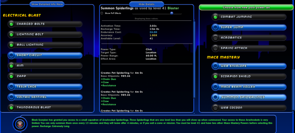 Hi there, I noticed some weird things with Mace Mastery for blasters. As mentionned in the typos topic, Web Cocoon has some strange, recursive requirement: "you have to select Web Cocoon in order to select Web Cocoon". Along with a doubled one. There is also some shenanigans lurking for Summon Spiderlings: it says you need two other powers but apparently one is enough to get it... Hope this helps.