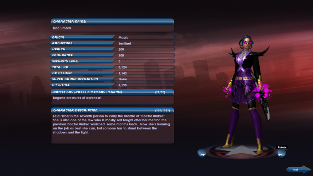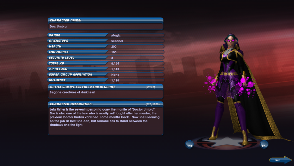 Thanks. Doc Umbra uses Energy Blast/Energy Manipulation so far. I took flight but I see that Sorcery has that so I may change that out at some point when I respec. I decided not to go with straight up dark powers since she;s kind of inspired by Dr. Strange & Dr. Fate. Hence, the energy powers. I'll try that Robotics/Electrical Affinity combo when I start playing her. Indeed. At the very least they use the same tailor. π
