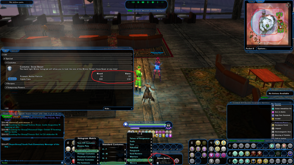 I took the time to grind over 200 candy canes tonight and I have at least 10 Prismatic Aether, yet the Elf Vendor in Pocket D will not let me create the Snow Beast Costume. I have tried everything I can think of. I deleted my Temp powers. I turned off all toggles. I logged out and logged back in a couple times. I even went and bought the Costume Accolade for 50 Prismatic Aether and a Rikti costume just to make sure costumes work on this character, and you can see in the screen shot I attached that I do not already have the costume. Even though influence is not listed as necessary, I have millions of influence. I tried asking help chat, and nobody knew. I could not get in touch with a GM. I did a web and forums search and found nothing. I am at a complete loss as to why I cannot create this Prestige Power. UPDATE: I logged out for a bit to make this post, and logged back in to give things another try. Now the Snow Beast costume does not show up in the list to buy anymore. *GAH*