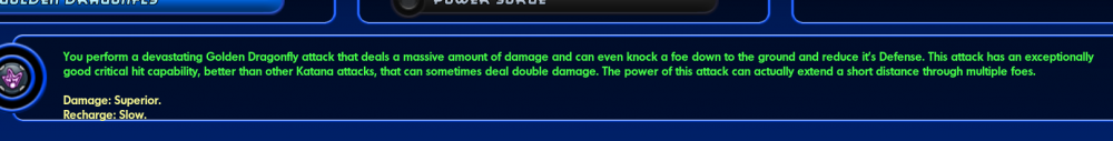 Another its/it's... The description for the Katana ability Golden Dragonfly says that it "...can even knock a foe down to the ground and reduce it's Defense." Should be "its Defense." Or if you like singular they, "their Defense." (I actually would prefer to use their here rather than its, especially since this is technically a cone attack.) Also, and this is not an error, but it is a bit redundant to say "knock a foe down to the ground." Either say, "knock a foe down" or "knock a foe to the ground." The extra wordiness as written does not add any additional clarity. (Note: This is for the Scrapper version of this power. I have not checked to see if other ATs with their own version of Golden Dragonfly have the same error.)
