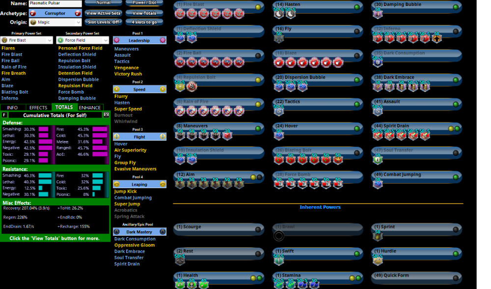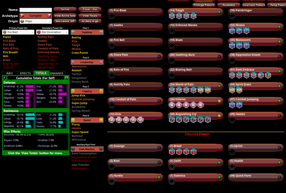 You build for def but have no steadfast +3 def which gives in 1 slot more def than your 6 slots of gaussians. You build for HP but have no unbreakable guard +7.5% HP which at 4 slots also gives melee def that you crave. When constructing a build, ensure key uniques and critical procs are in the right positions before you go off chasing set bonuses. Take fire blast, not flares. Better DPA and recharges within the animation time of any of your other attacks. Def/insulation shield should be slotted lotg, +5 lotg: D (not D/E) for a 2-slot budget. You don't need the endrdx because it lasts 4 mins and costs only 7.8 end. PFF is one of very few powers in the game that are nigh-useless. You may think it makes sense for emergencies, but if you are old and addled (your words, not mine), you want to avoid powers that require you to toggle them on to avert disaster (as PFF does), because you are less likely to recognize the danger and activate them in time. You want passive defenses and mitigation such as def and res set bonuses, or at least powers that you routinely use every time they are available, such as barrier. Besides, you have PFF, repulsion field and a self-rez, so this sounds excessive to me. Drop it and move the lotg to CJ (loses only 0.34% def to all). When slotting CJ and hover try to use them as your lotg mules. As I have just demonstrated, a single lotg in CJ/hover is slot-efficient because the lotg special boosts def, other defense uniques like kismet, winter's and reactive def do not. Hence, mule the lotgs in CJ/hover, and mule the non-def-boosting uniques elsewhere. Rep-bolt and force bomb are used for their -res, the most important debuff in the game. They are a critical part of FF's arsenal, should not be skipped, and should be taken at the earliest opportunity (level 4/28). Damping is overslotted. It is a location aoe not a toggle, and the cost is low, so you don't need endrdx. Slotting def enhancement increases the strength of the -def resistance. This can be worthwhile, but you can cap it with 1-3 slots; there is no need to give it 5. Dark embrace is underslotted despite the effort you put into chasing res bonuses, a classic case of penny wise, pound foolish. Slotting in soul transfer and inferno should be swapped. Inferno is the dps power, so it should get the set with the better damage proc, better endrdx and the -res proc. This can be chalked up to playstyle differences but you do not need melee def as a hoverblaster. You have no powers that require hanging out in melee, except for briefly dipping in for an inferno. Armored toons need melee def, because they both stay in melee for prolonged periods AND often have aggro auras that make mobs cluster tightly around them and not run, you do not. This is a very minor gain, but purples and pvpios can be boosted +5 without losing set bonuses when exemplared. For all your fear of dying I am surprised to see you have no prevmed proc. It can be useful because the chance to proc goes up when you are at low HP. This is a minor nitpick but maneuvers is overslotted. 4 slots is the max number of shield walls you need, for the EN res. Mitigation toggles typically do not need more than 3-4 slots because you really only want 3 things from them, def/res, endrdx, and uniques/procs. There are a few exceptions (a few tankers may find it worthwhile to have a 6x unbreakable guard for the res, on some builds with poor set diversity 6x glad armor is a way to get ranged def from a power that normally doesn't give it) but in general you do not need to slot them too heavily. No spirit drain. Spirit drain is very good even though it can now only max out at around 50% uptime, unlike the old soul drain (note: duration is 15s, mids is incorrect). Aim + spirit drain + inferno. You seem to be taking clarion radial for the +special. Because you already have mez prot vs all but sleep from disp bubble, a potential alternative is to take soul (not dark) mastery, which offers power boost, soul drain and dark embrace instead, but no self-rez. This can then free you to take a different destiny, either barrier or ageless, the former of which will result in higher def across the board for you and your team. Only you can decide if you die often enough to neez a self-rez, though. You seem to be using support hybrid to softcap. As a note of caution, support hybrid is not permanent. When activated, the toggle stays active for 2 mins; then it detoggles on its own and starts recharging, which takes another 2 mins. Hence, its uptime will only ever be 50% at most. I'm sorry if I sound like I'm talking down to you and telling you lots of things you already know, but I've already seen multiple basic misconceptions in this build, so I'm being thorough. Your overall build goals and incarnate strategy can be rethought. Right now, you have agility. Agility is a defensive alpha. It tanks your proc chances and hence dps, and in return, both boosts def and frees you to chase def bonuses without regard to rech. If you're using agility alpha, you should cut some rech bonuses and try to hit 40% or 45% def to R/aoe without hybrid. As it is, you have "too much" rech (hasten is far above permanent at current rech levels) and "too little" def if we discount the def you are getting from hybrid, which is not permanent. A fightingless R/aoe softcap is easily achievable with 3 +def pool powers and agility alpha: This is with support hybrid OFF and hasten at a rech of 120.1s. 4 slots to spend. Your -KB is in the gladiator's armor 3x bonus. In fact, agility is not required: FF has no long-recharging powers that require hasten. It is perfectly fine to drop agility for some other alpha, usually musc radial or intuition radial (musc would also keep the endmod bonus), buff the def a little to compensate, and just live with hasten being 2-8s off perma. Put an FF proc in force bomb or something, if it truly bothers you. My own fire/FF runs musc/barrier/assault with tri-vector softcap and soul mastery.