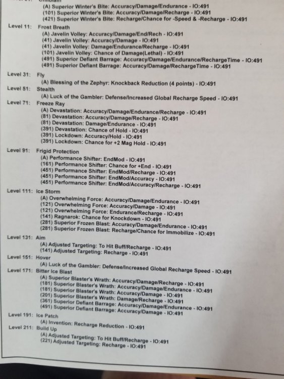 I don’t know if this has been reported or if there is even a patch in the works, but the printed copy of the build planner has a bug when displaying the levels of powers, slots, and the enhancements themselves. If you’ll look at the image, Frost Breath was taken at level 2, Fly at level 4, Stealth at level 6, etc., the usual progression of a power every even level up to level 32. However, they all show odd levels because of something whacky going on. What it shows is that for each of those power picks, a level has been subtracted and a ‘1’ has been added to the end of each level so that now Frost Breath is level 11, Fly is level 31, Stealth is level 51. Also, each enhancement should be max level for its range so for example, Javelin Volley should show as level 50, but again, Mids is subtracting a level from it and adding a ‘1’ to the end. I use the Multi-Page (Long Format), Print History Page, Print Invention Levels, Double Sided (Long Edge Bind) print options. -