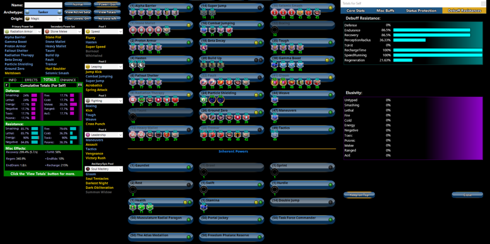Apologies in advance for the word soup that follows. I'm horrible at organizing my thoughts! I'm not the biggest fan of Tower builds, so I would be scrutinizing from a very offense-oriented point of view. Stone Melee is fantastical at utilizing FF procs! So much so that I would argue you could forego slotting Purples for recharge and just load up on procs instead! What you really want to be doing with those funds is loading up on Winter sets. I know you stated you avoid using them out of fear of the price, but they pay for themselves! Just slotting a 2-piece of most Winter sets will grant you Slow Resistance, which lets you mitigate -recharge debuffs. Since you're Rad Armor, you'll be taking every debuff to the face, so being immune to the most problematic of them is great value! Just get Lords of Winter Super Packs instead of trying to buy the enhancement directly from the AH. It's more cost effective and you get a lot of bonus goodies! Radiation Therapy is missing 1 critical IO - Theft of Essence: Chance for +Endurance. This extremely balanced IO has a very high chance to sap End from every target hit, guaranteeing a full refill on click. This will handily solve any End problems you might have running Stone Melee! Fault should absolutely be slotted for damage. It's on such a low timer that the KD spam alone will be enough control to keep you very safe! Take advantage of it slotting Ranged AoE sets and drop an Anhilliation: Chance for -Res in there. It has a good proc rate and will soften up targets so that Tremor can actually do something! 1 overarching thing that I disagree with in your build strategy is overslotting Maneuvers, Weave, and Tactics to try and build DEF. Rad Armor Tankers absolutely do not need DEF in order to be impervious to 98% of content. Having great RES, a great heal, 3k effective HP (whatever you have now + 800-1k absorb from Particle Shielding), and a secret 4th thing is more than enough to deal with mobs! By the way, the secret 4th thing is Rad Armors ability to inflate your damage through clever use of the IO system! Here, I can post a build to provide an illustration of what I mean. **This is 100% a no expense spared endgame build** Tanker (Radiation Armor - Stone Melee).mbd As you can see, my Tanker here sacrifices a tiny bit of protection for a ridiculous amount of offensive output. You were asking about Ground Zero, so check this out! This is a nuke. There are no ifs ands or buts about it. You have a nuke in your armor set. In fact, this is a nuke too! A nuke that heals your HP and End?! On top of your armor set being a Blaster primary, Stone Melee's proc math is excellent and is where the set can really be taken to the next level. I hope some of these ideas help you out!