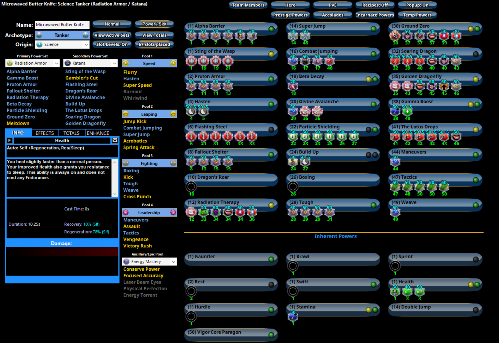 Hi there! It looks like the version of Mids you're using has a borked Export feature. It seems like you're up to date enough that using the in-app Updater tool should get you where you need to be. Or, you can always link the file for your build directly! Not many do this, but the option has always been there. As for a Rad/Katana toon, I did take a look at one so I could at the very least offer a take to hopefully give you a few ideas. I'm horrible at making exemplar-friendly builds, but I tried my best! View This Build In MRB