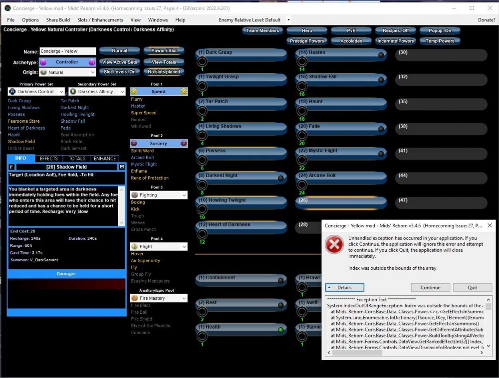 Hi, I just updated my MIDS to the latest release and started working on a backlog of builds. Everything was fine until I wanted to do one for my Dark/Dark controller. For some reason I get Unhandled Exception errors on both my laptop and my desktop machines. This isn't the first new build I've started with the updated version but the exception seems to get easier to get as I move forward. The first time I get this error is when I open up City of Heroes to look at the character when I had powers filled out to level 20. I got as far as 26 before MIDS crashed again. Restoring the build at level 26 consistently crashes after a second or two without doing anything. This error was indepndently reproduced on both my laptop and desktop systems. Both use Win 10, latest version. Both reinstalled the new version of MIDS at the same time, maybe 2 days ago. Desktop has 32GB of memory. Laptop more like 8GB Moe details available on request.