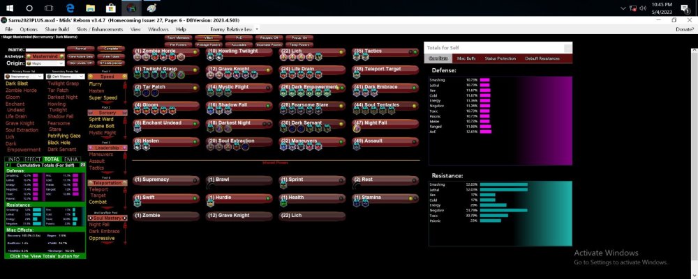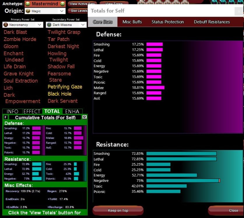 Ok, prolly because my version is old, and sadly new mids is too buggy for my setup, but this is as close as I can export the latest build. As you can see from pic, I slotted twilight with 2 Hamis, 3 touch of the nictus and a +chance for endurance theft. Dont know why it isnt exported same with tar patch. - Edit:Will add manually 🙂 Rationale is that yes, perhaps Gloom and Life Drain are the only ones I need to pop 1 or 2 extra ghosts. I want to use main attacks, pets and cones to debuff mostly and it is part of a rp build I wanted but want to keep it with this theme. Have taken into consideration all of your suggestions! Please do another critique, I think I Have fine tuned it to more or less what is possible with the current powers I want out of this build. To be used mainly for missions, taskforces and exemplaring up and down and perhaps an occasional +1 to +2 (and if possible +3 but not really wanting to push it with an rp build not setup for max efficiency) This Villain build was built using Mids Reborn 3.4.7 https://github.com/LoadedCamel/MidsReborn Click this DataLink to open the build! Level 50 Magic Mastermind Primary Power Set: Necromancy Secondary Power Set: Dark Miasma Power Pool: Speed Power Pool: Sorcery Power Pool: Leadership Power Pool: Teleportation Ancillary Pool: Soul Mastery Villain Profile: Level 1: Zombie Horde (A) Superior Mark of Supremacy - Accuracy/Endurance (3) Superior Mark of Supremacy - Damage/Endurance (3) Expedient Reinforcement - Resist Bonus Aura for Pets (5) Sovereign Right - Resistance Bonus (5) Edict of the Master - Defense Bonus (7) Overwhelming Force - Damage/Chance for Knockdown/Knockback to Knockdown Level 1: Twilight Grasp Hamidon Origin:Golgi Exposure Hamidon Origin:Golgi Exposure Touch of the Nictus Touch of the Nictus Touch of the Nictus Theft of Essence Level 2: Tar Patch D-Sync Origin:D-Sync Deceleration D-Sync Origin:D-Sync Deceleration Pacing of The Turtle Chance for Rech Level 4: Gloom (A) Apocalypse - Damage (15) Apocalypse - Damage/Recharge (17) Apocalypse - Damage/Recharge/Accuracy (17) Apocalypse - Recharge/Accuracy (19) Apocalypse - Damage/Endurance Level 6: Enchant Undead (A) Resist Damage IO Level 8: Hasten (A) Recharge Reduction IO (19) Recharge Reduction IO Level 10: Howling Twilight (A) Recharge Reduction IO (21) Recharge Reduction IO Level 12: Grave Knight (A) Superior Mark of Supremacy - Accuracy/Damage (21) Superior Mark of Supremacy - Accuracy/Damage/Endurance (23) Soulbound Allegiance - Chance for Build Up (23) Achilles' Heel - Chance for Res Debuff (25) Touch of Lady Grey - Chance for Negative Damage (25) Shield Breaker - Chance for Lethal Damage Level 14: Mystic Flight (A) Blessing of the Zephyr - Knockback Reduction (4 points) (27) Blessing of the Zephyr - Run Speed, Jump, Flight Speed, Range (27) Blessing of the Zephyr - Run Speed, Jump, Flight Speed, Range/Endurance Level 16: Shadow Fall (A) Luck of the Gambler - Defense/Increased Global Recharge Speed (29) Gladiator's Armor - TP Protection +3% Def (All) (29) Unbreakable Guard - +Max HP Level 18: Darkest Night Hamidon Origin:Enzyme Exposure Hamidon Origin:Enzyme Exposure Dark Watcher Despair: Chance for Slow Level 20: Soul Extraction D-Sync Origin:D-Sync Optimization Call to Arms Def Bonus Sup. Command MM Recharge Pets + Aoe Def Sup Mark of Supremacy EH #1 and #6 Level 22: Lich (A) Superior Command of the Mastermind - Accuracy/Damage (34) Superior Command of the Mastermind - Damage/Endurance (34) Superior Command of the Mastermind - Accuracy/Damage/Recharge (34) Superior Command of the Mastermind - Accuracy/Damage/Endurance/Recharge (36) Cloud Senses - Chance for Negative Energy Damage Level 24: Life Drain (A) Decimation - Accuracy/Damage (36) Decimation - Damage/Endurance (36) Decimation - Damage/Recharge (37) Decimation - Accuracy/Endurance/Recharge (37) Decimation - Accuracy/Damage/Recharge Level 26: Dark Empowerment (A) Preventive Medicine - Heal (37) Preventive Medicine - Heal/Endurance (39) Preventive Medicine - Endurance/RechargeTime (39) Preventive Medicine - Heal/RechargeTime (39) Preventive Medicine - Heal/RechargeTime/Endurance (40) Preventive Medicine - Chance for +Absorb Level 28: Fearsome Stare (A) Glimpse of the Abyss - Chance of Damage(Psionic) (40) Glimpse of the Abyss - Accuracy/Recharge (40) Glimpse of the Abyss - Accuracy/Endurance (42) Glimpse of the Abyss - Accuracy/Fear/Recharge (42) Glimpse of the Abyss - Endurance/Fear Level 30: Dark Servant D-Sync Origin:D-Sync Siphon D-Sync Origin:D-Sync Siphon (43) Cloud Senses - Accuracy/ToHitDebuff (43) Cloud Senses - ToHit Debuff/Endurance/Recharge (45) Cloud Senses - Chance for Negative Energy Damage Level 32: Maneuvers (A) Luck of the Gambler - Defense/Increased Global Recharge Speed (45) Reactive Defenses - Scaling Resist Damage (45) Shield Wall - +Res (Teleportation), +5% Res (All) (46) Kismet - Accuracy +6% (46) Kismet - Defense/Endurance Level 35: Tactics (A) Gaussian's Synchronized Fire-Control - Chance for Build Up (46) Gaussian's Synchronized Fire-Control - To Hit Buff/Endurance Level 38: Teleport Target (A) Blessing of the Zephyr - Knockback Reduction (4 points) Level 41: Dark Embrace (A) Unbreakable Guard - Resistance (48) Unbreakable Guard - Resistance/Endurance (48) Unbreakable Guard - Resistance/Endurance/RechargeTime Level 44: Soul Tentacles (A) Gravitational Anchor - Immobilize/Recharge (48) Gravitational Anchor - Immobilize/Endurance (50) Gravitational Anchor - Recharge/Accuracy (50) Gravitational Anchor - Immobilize/Recharge/Accuracy (50) Gravitational Anchor - Chance for Hold Level 47: Night Fall Hamidon Origin:Lysosome Exposure Level 49: Assault (A) Endurance Reduction IO Level 1: Supremacy Level 1: Brawl You can see in image current enhancements and bonuses. ComeArepasNECROBUILD.mxd