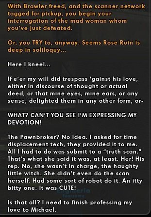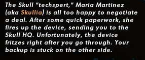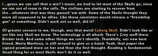 Arc 25 from our second author on "TerroirNoir's Cable Channel of AE" Reviews is @cranebump's Fallout 2: The Puzzle Box. Mission 1: Noble in Reason. So, one call later and I'm talking to Teknique. And that's not a fun proposition. Last time we really interacted she betrayed us for "the greater good". But all is forgiven it seems. She's still a PITA though. Mr. Finley says jump and she jumps but she grumbles about the jumping, the height, where she has to jump, is there a rope, landing. All the good stuff. I'll just wait for her to calm down and tell me what the hell is going on with the Autumn Wards these days. So after the...can't believe I'm saying this, and I was THERE...transdimensional cyborg Skulls hit the Wards' warehouse and pilfered a lot of stuff, the Wards tracked things down and tidied up all the loose ends. Seems whoever broke in knew every aspect of their security. Ah, inside job, Teknique? Just saying. So, here I am. A rare trusted outsider...ah, I get it. It couldn't have been me so that's why I'm here. Go ahead. So we have a lead involving a symbol of three stylized spheres, like a pawnbroker. You do know there's a guy in the Rogue Isles goes by that handle, yeah? Did you check him? Ok, you need me to check a place. I'm on it. Snakes. Why did it have to be snakes? Well this place is just the best. On we go then. Here snakey snakey. Here...boy? Girl? Enby? Ok, I deal with a few of the slithering kind along the way and then I run into this guy. I mean...you're not seriously telling me that's your real name, are you? Ooop. Held. You bet it's a punch! Your scaly henchsnake can take a nap. Time for you to fess up, "Beau". Sheesh. I need a new line of work. I wonder if City Hall is hiring people for tours and things? I considered that teaching job with Hero Corps but I dunno. Ok, Beau fesses. I mean there's definite fessing going on. I just don't know his jargon, you know. Leech Lizard? Anna? Are those people? I hope so. Time to move further into these scale-infested caves then. Further on I find Anna. Anna Cohnda. Yeah. You thought Beau was bad. And she's a real piece of work too. (Check her bio when you play this) Nope, I don't give a rats ass what your finances are, Anna. I'm just gonna beat the tar out of you until you stop moving. Capice? (Speaking of rats, you never see any...oh wait, snakes eat rats. Never mind.) She's never met any pawnbroker. She did meet some mysterious woman in a trench coat though, who was disguising her voice. Ah, the classics. I wonder is Shadowy Figure still hanging out in Nerva? Where was I? Oh yeah. There's a Leech Lizard to find, or Ms. L as Anna called her. Of course the next person I meet isn't Anna, it's some hired muscle called Ales. Ales? Like the beer? Is ale a beer? Whatever. So, he's a pain too. In fact everyone I've met so far, including my contact, is a bit of a pain. Maybe it's me. You know the saying? If everyone you meet is an asshole, maybe you're the problem? I'm gonna ignore that and carry on with my sterling investigation work. So this Ales. He too is having a bad day. All the more so for meeting me! Snakes? I understand, honestly I do. Oh. Oh wait, it's SCales. As in Scales. Doh. Why me, lord? Why me? And somewhere in here Anna still waits. So you see, things get odd. I'm wandering these damn caves looking for Leech Lizard, and I must have circled back on myself because who do I meet? ALES! Again. Except he's got up and serum boosted himself this time. Oh Jeez Louise. I am never getting out of this hole of a place, am I? Beat you a second time? Well, I'm gonna give it the ol' college try, that's for sure! And I do put him down. A second time. And stay down this time! Wouldn't you know it? Leech Lizard is far more reasonable than anyone else here. She's not exactly polite but she's willing to talk and that's a bonus. 30 seconds, huh? Ok then. So we chat and she fills me in. Finally. The sooner I get out of this scale-infested pit the better. At least Paragon doesn't have snake dens/pits/whatevers. Time to go to see "resting traitor face" Teknique in person I suppose. No, I don't trust her. See my previous interactions with the woman. Though unlike many others she never actually pretended to be nice. I'll give her that at least. And finally, Leech Lizard gave me a name. Rose Ruin. A crazy lady obsessed with Michael White. Not BABs, the OTHER one. Oy. And Teknique says that ...wait for it...someone on the inside must have sold us out. Told ya. [Mission 1 = Despite my in character moaning that mission is a lot of fun. Well done! I recommend it. Now, on to the next one!] Mission 2: Infinite in Faculty. Teknique does lay things out clearly though. She lists all the supers who have worked for the Autumn Wards and their contact/security levels. It can't have been them. None of the PPD liaisons had the right access either. A few names are thrown around, Paula Halmos, Milos Lazkovich and Johann. But access would have changed after their tenure. So that leaves? She doesn't know. So Engineria here is going hunting for Rose Ruin. Seems that woman is obsessed with Marauder from Praetoria. Except HER Praetoria. Wait...oh no, there's more than one Praetoria? Great. Just great. So to put the icing on the cake, Michael White AKA Back Alley Brawler, is AWOL. Yikes. Time to go looking. I thought snakes were bad. But no, back in the sewers. Lucky me. Lucky lucky me. I go stealthy and sneak my way through. I do not see the need to get covered in sewer water just because some punk wants a trophy of a super. Nope. And what's this? A spectral scanner! Let's have a looksee at this beauty. Oh, that looks technical. I'll scribble that down and hope some of the Wards folk have a notion what the hell it means. Although...CHLKR? Chaliker? Those gimboids? Oh I hope not. They were such a pain before. Further on I find a console with various coordinates logged into it. They all seem to be pointing to the same spot. And it looks like Michael and Rose are the t
