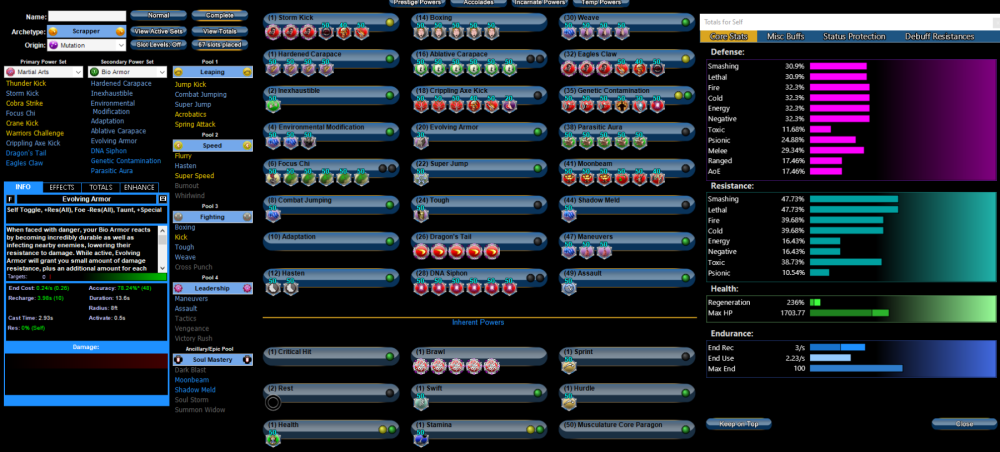 So, because of @Ratch_'s recent post regarding TW, I swapped my rotation and slotting up in my TW/ENA a bit. And Shaved 9s off my pylon time Scrapper TW/ENA 1:23 (Degen/RoF/MA/Enflame/Proc) BM - FT - AoD - RA - FT - AoD - RA- FT RoF - CB - FT - AoD - RA - FT If the FF procs don't go off in the BM chain I'll do a Whirling Smash after the second FT. So it'll look like: FT - AoD - RA- FT - WS - RA - FT This is NOT a best run. This is an average of 10+ runs, hybrid OFF. Scrapper - Titan Weapons - Energy AuraRoFEnflameTest.mbd