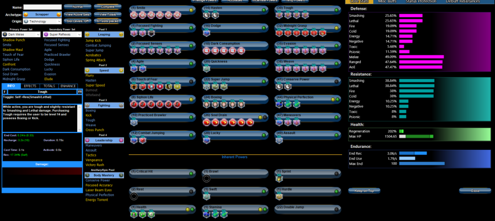 Maybe you'll get some ideas. With this much recharge you will NOT need both SP and Smite. DM and SR are both pretty End friendly. This WILL do some AOE. Take note how Dark Consumption and Soul Drain are slotted. You can get even more AOE if you take the Mu Mastery Epic Pool. I very much disagree with Siphon Life being slotted for heals, but hey, you do you. No clue which Destiny you plan on taking, but if you do Ageless: Recovery you won't have End issues 45+ ever again. Obviously, take Muscle Alpha. ToF has a Accuracy modifier of 1.0. It needs ACC in it to hit. Don't get it twisted. Regen is priority last in terms of survivability. Def>Res>HP>-----Regen If you have 110HP with 1hp/s and get hit for 101 you live. If you have 100HP with 10hp/s and get hit for 101 you're dead. You regen nothing when dead.