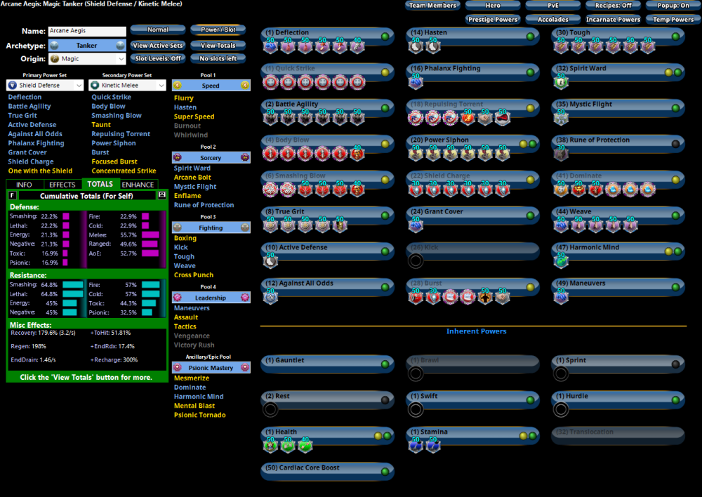 Jumping off of @One IV All's Cap post, I have been working on a homage myself to the crossover hero Solider Supreme (Cap + Doc Strange). I felt like Shield/Kinetic Melee was kind of the perfect fit. Anyways, this is what I'm looking at some far and would love anyone's thoughts/feedback. Some notes: Definitely looks end heavy. Will have to rely on teaming (which I plan to do) or some accolades. I took at look of "thematic" choices which I know might not be optimal. I went Sorcery Tree for Spirt Ward, Mystic Flight and ROP. I might be better served just going standard flight for some extra defense, or dropping that altogether go leaping pool for combat jumping. I usually ALWAYS take taunt, but Repulsing Torrent kind of functions as a ranged taunt here. I do like focused burst as well... however I skipped due to so many power selections. Perhaps I'm better served moving some things around to pick it up, as having another ranged attack with Repulsing Torrent is pretty unique to Kinetic Melee? Arcane Aegis - Tanker (Shield Defense - Kinetic Melee).mbd