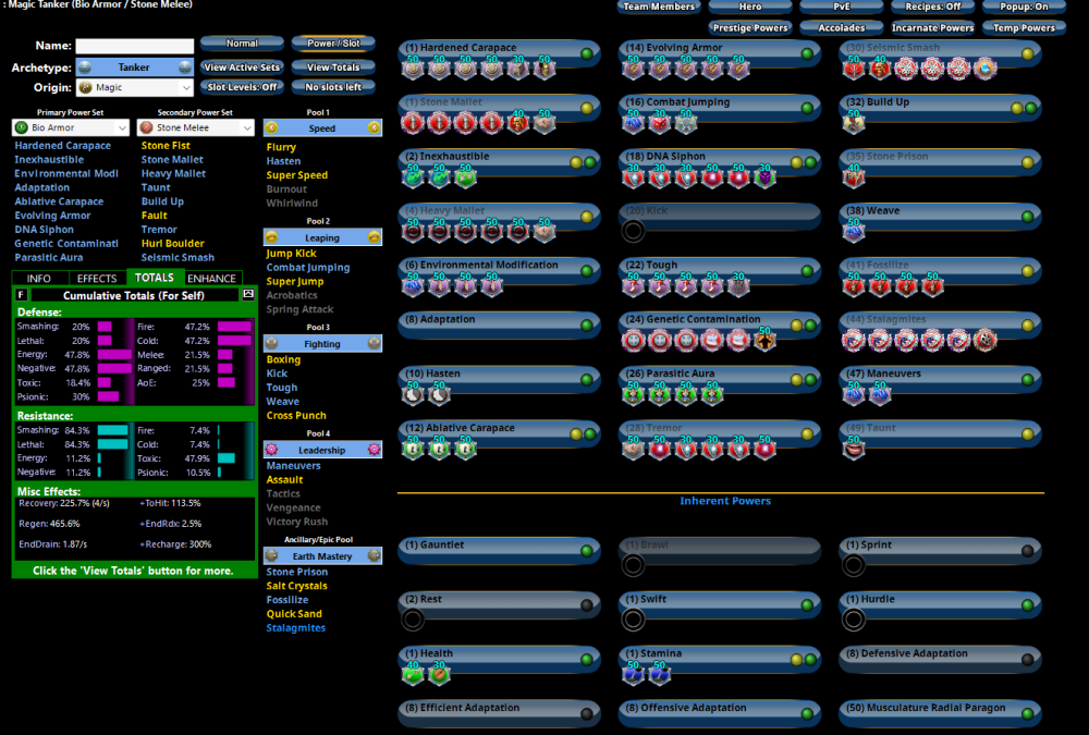 I was messing around with Bio/Stone myself. I went with Energy Mastery for Focused Accuracy and Physical Perfection, but I rejigged things to get Earth For you. I had to drop fault to do it. Not sure if it was worth it. I'd leave it to better builders like @Xandyr, @Sovera, @Onlyasandwich, @Story Archer and @Spaghetti Betty to chime in on that. Now that you mention it as well, Stone/Ice seems like it'd be great on a Scrapper or Stalker. I think @Onlyasandwich had a build floating around once. Tanker (Bio Armor - Stone Melee - Earth).mbd