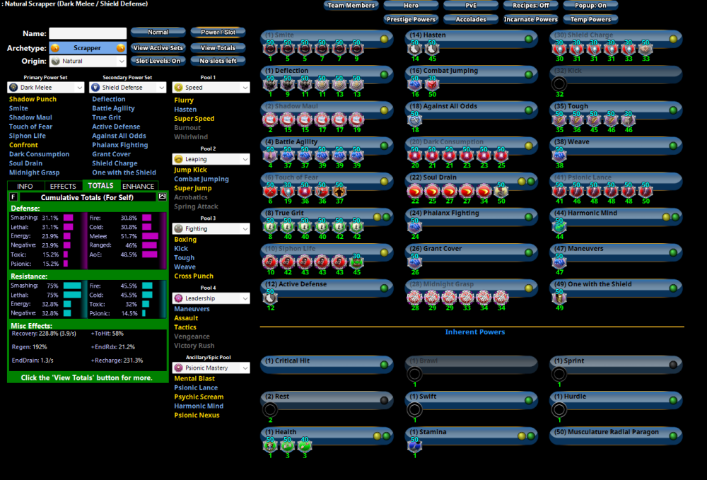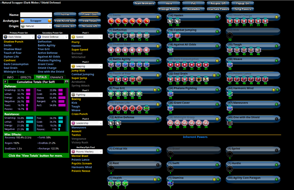 Hi all! Since I (finally) have mids, I've been playing around with my builds rather than just flying by the seat of my pants 😂 I love DM/Shield and the synergy it brings, and this is what I'm currently running. Some notes: I wanted to have soft capped positions, capped S/L resist and decent damage. I definitely gave up some proc opportunities. I also went with the new Psi Epic pool to grab Harmonic Mind to help with endurance a bit and further justify the Musculature Radial Alpha choice. I felt that I had enough AOE with Shield Charge, Shadow Maul and a proc'd out ToF (thanks @SomeGuy!) Anyways, would love suggestions or any ideas/easy fixes where I can improve. Scrapper (Dark Melee - Shield Defense).mbd