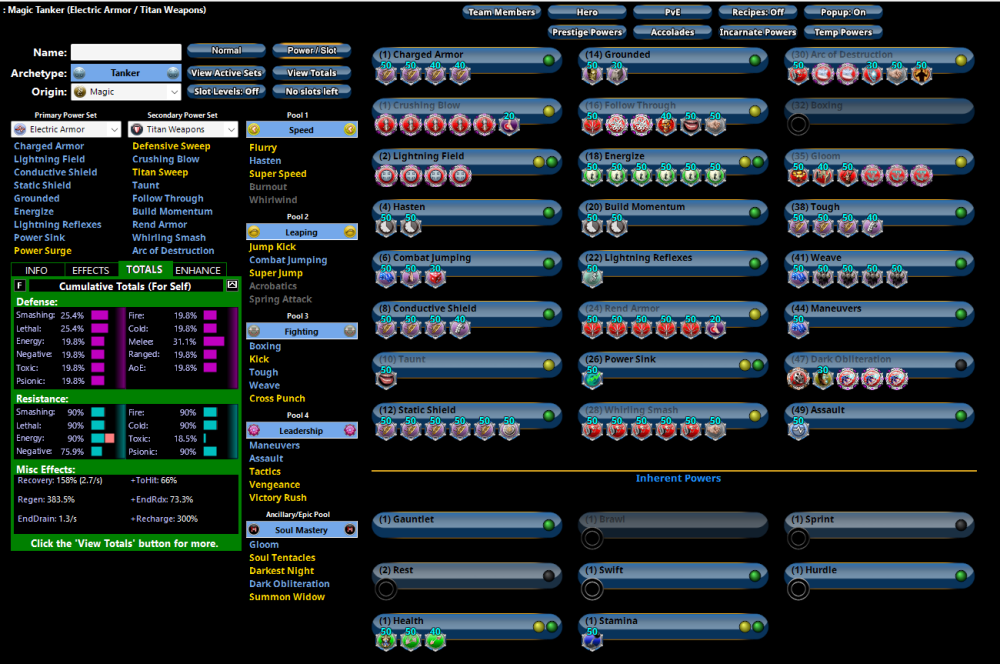 First time doing/sharing a mids build, so I hope I'm doing it right! Would love insight/feedback on things to change. Thanks @Ratch_ for some suggestions on the TW attack slotting! I'm not sure if I have anything toggled on, but I don't believe so since I didn't select any incarnate powers. I'm looking to go Musc Radial for Alpha slot however. Other incarnate suggestions are welcomed! Looks like I was able to hit 90% to everything but NegE (75.9%) and Toxic (a measly 18.5%). I decided to just let that hole be and just to strengthen up in other areas. One possible change is to switch Crushing Blow out for Defensive Sweep. That should allow me to hit softcap on Melee Defense, but I'm not sure if it is worth it on a set with no DDR. It would allow for another LOTG mule however. One other question: It says my +ToHit is at 66%. Would it be better to drop Assault and pick up Tactics? Data chunk Tanker Elec-TW.mbd