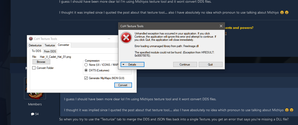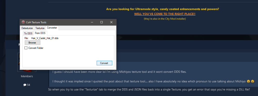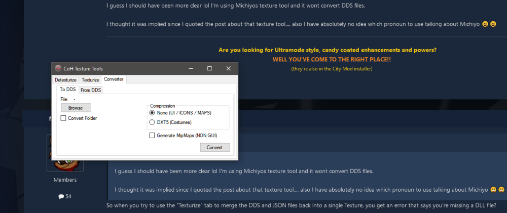 I really can't tell if you're joking around with me or not lol I'll break it down, with images, just in case you're serious. So I click on converter, to convert to DDS Then I click on convert and the dialog box pops up telling me I need a DLL. Now if I try to convert from a DDS and click on Convert... nothing happens. I'm guessing it should convert a DDS to an image file since there are seperate tabs for converting texture files but that's not really clear. The details from the error dialog, in case Michiyo wants to read them. -