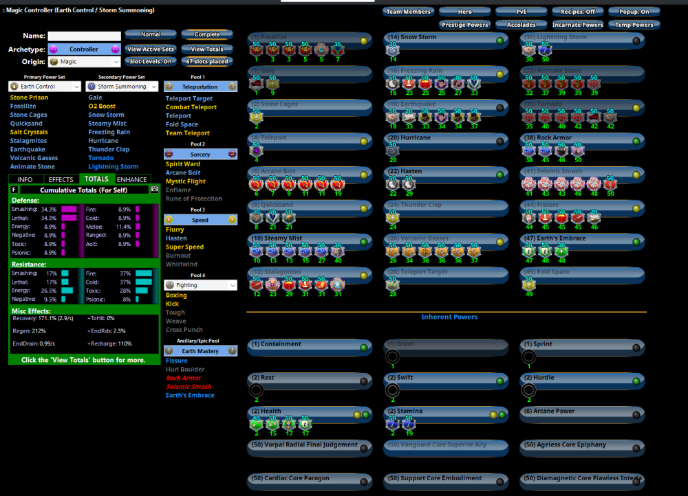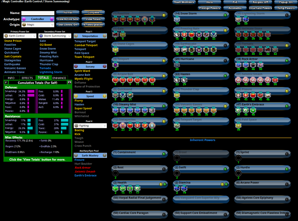 So here is the build I have been running which is working out great. With Hurricane going I still have all the endurance I need. I was running the Cimmera Nictus TF with a team and got some nice compliments that I was running StormCloud2 the way a stormie should be run. We had a good time. I am already thinking about a respec though as I miss getting up close and personal and wonder if I can run with 40% S/L defense. So first my current build which works very well if you like staying at range and running hurricane. This Hero build was built using Mids Reborn 3.0.2.19 https://github.com/Reborn-Team/MidsReborn Click this DataLink to open the build! Level 50 Magic Controller Primary Power Set: Earth Control Secondary Power Set: Storm Summoning Power Pool: Sorcery Power Pool: Speed Power Pool: Leadership Power Pool: Leaping Ancillary Pool: Ice Mastery Hero Profile: Level 1: Fossilize -- BslGaz-Acc/Hold(A), BslGaz-Acc/Rchg(3), BslGaz-Acc/EndRdx/Rchg/Hold(3), BslGaz-EndRdx/Rchg/Hold(5), Apc-Dam%(5), UnbCns-Dam%(7) Level 1: Gale -- SuddAcc--KB/+KD(A), FrcFdb-Rechg%(7), Acc-I(9), JvlVll-Dam%(9), PstBls-Dam%(13), Bmbdmt-+FireDmg(46) Level 2: Stone Cages -- EnfOpr-EndRdx/Immob(A), EnfOpr-Acc/EndRdx(21), EnfOpr-Acc/Immob/Rchg(23), EnfOpr-Acc/Immob(37) Level 4: O2 Boost -- Prv-Heal(A), Prv-Heal/EndRdx(11) Level 6: Spirit Ward -- Prv-Heal(A), Prv-Heal/EndRdx(11) Level 8: Arcane Bolt -- FrcFdb-Rechg%(A), Dcm-Build%(23), GldJvl-Dam%(25), ExpStr-Dam%(25), Apc-Dmg(34), GldJvl-Acc/Dmg(40) Level 10: Steamy Mist -- LucoftheG-Def/Rchg+(A), LucoftheG-Def(13), LucoftheG-Def/EndRdx/Rchg(15), LucoftheG-Def/EndRdx(27), LucoftheG-EndRdx/Rchg(27) Level 12: Stalagmites -- AbsAmz-Acc/Rchg(A), PstBls-Dam%(29), Bmbdmt-+FireDmg(31), Ann-ResDeb%(31), SprWiloft-Rchg/Dmg%(31), SprOvrPrs-Rchg/Energy Font(33) Level 14: Hasten -- RechRdx-I(A), RechRdx-I(33) Level 16: Freezing Rain -- RechRdx-I(A) Level 18: Earthquake -- FrcFdb-Rechg%(A) Level 20: Hurricane -- EndRdx-I(A) Level 22: Super Speed -- Clr-Stlth(A) Level 24: Rune of Protection -- StdPrt-ResDam/Def+(A), GldArm-3defTpProc(34) Level 26: Volcanic Gasses -- BslGaz-Acc/Hold(A), BslGaz-Rchg/Hold(34), BslGaz-Acc/EndRdx/Rchg/Hold(36), BslGaz-EndRdx/Rchg/Hold(36), Lck-%Hold(36) Level 28: Maneuvers -- LucoftheG-Def/Rchg+(A), LucoftheG-Def/EndRdx/Rchg(29), Rct-ResDam%(33), LucoftheG-Def/EndRdx(37), ShlWal-ResDam/Re TP(45), LucoftheG-Def(46) Level 30: Combat Jumping -- LucoftheG-Def/Rchg+(A) Level 32: Animate Stone -- ExpRnf-+Res(Pets)(A), ExpRnf-Acc/Dmg(37), ExpRnf-EndRdx/Dmg/Rchg(39), ExpRnf-Acc/Dmg/Rchg(39), SlbAll-Dmg/EndRdx(39) Level 35: Tornado -- SlbAll-Dmg(A), SlbAll-Dmg/Rchg(40), SlbAll-Acc/Rchg(40), SlbAll-Build%(42), SuddAcc--KB/+KD(42), FrcFdb-Rechg%(42) Level 38: Lightning Storm -- FrcFdb-Rechg%(A), SuddAcc--KB/+KD(43), PrfShf-End%(43), GldJvl-Dam%(43), ExpStr-Dam%(45) Level 41: Hibernate -- RechRdx-I(A) Level 44: Frozen Armor -- LucoftheG-Def/Rchg+(A), LucoftheG-Def/EndRdx(45), LucoftheG-Def/EndRdx/Rchg(46), LucoftheG-Def(50) Level 47: Frost Breath -- Bmbdmt-+FireDmg(A), ImpSwf-Dam%(48), JvlVll-Dam%(48), PstBls-Dam%(48), Rgn-Knock%(50), Rgn-Dmg(50) Level 49: Ice Storm -- RechRdx-I(A) Level 1: Containment Level 1: Brawl -- Empty(A) Level 1: Sprint -- Empty(A) Level 2: Rest -- Empty(A) Level 2: Swift -- Empty(A) Level 2: Hurdle -- Empty(A) Level 2: Health -- Mrc-Rcvry+(A), NmnCnv-Regen/Rcvry+(15), Pnc-Heal/+End(17), Prv-Absorb%(17), Prv-Heal(19), NmnCnv-Heal(21) Level 2: Stamina -- PrfShf-EndMod(A), PrfShf-End%(19) Level 50: Freedom Phalanx Reserve Level 50: Portal Jockey Level 50: Task Force Commander Level 50: The Atlas Medallion Level 50: Vorpal Radial Final Judgement Level 50: Vanguard Core Superior Ally Level 50: Ageless Core Epiphany Level 50: Cardiac Core Paragon Level 50: Support Core Embodiment ------------ And now my new potential build where I will be relying on powers that slow and hold and getting into melee range as my finishing move. I like that I was able to get Stone Mastery back in as my Epic pool and still have plenty of powers that with procs now do decent damage. So if I can get by with a little less defense which seems likely since most of my attacks have -5% To Hit debuffs I should be able to do more damage while having more HP and a great occasional large heal from Hoarfrost. Any thoughts? This Hero build was built using Mids Reborn 3.0.2.19 https://github.com/Reborn-Team/MidsReborn Click this DataLink to open the build! Level 50 Magic Controller Primary Power Set: Earth Control Secondary Power Set: Storm Summoning Power Pool: Force of Will Power Pool: Leadership Ancillary Pool: Stone Mastery Hero Profile: Level 1: Fossilize -- Apc-Dmg/Rchg(A), Apc-Dmg/EndRdx(3), Apc-Acc/Dmg/Rchg(3), Apc-Dam%(5), SprEnt-Rchg/AbsorbProc(5), EntChs-Heal%(7) Level 1: Gale -- SuddAcc--KB/+KD(A), FrcFdb-Rechg%(7), Acc-I(9) Level 2: Stone Cages -- Acc-I(A) Level 4: Mighty Leap -- UnbLea-Stlth(A) Level 6: Project Will -- FrcFdb-Rechg%(A), EntChs-Heal%(23), ExpStr-Dam%(25), Dcm-Build%(25), Apc-Dmg(34), Dmg-I(40) Level 8: Weaken Resolve -- TchofLadG-%Dam(A), AchHee-ResDeb%(9), ShlBrk-%Dam(11), CldSns-%Dam(11) Level 10: Steamy Mist -- LucoftheG-Def/Rchg+(A), LucoftheG-Def(13), LucoftheG-EndRdx/Rchg(13), LucoftheG-Def/EndRdx/Rchg(15), LucoftheG-Def/EndRdx(27) Level 12: Stalagmites -- AbsAmz-Acc/Rchg(A), PstBls-Dam%(29), Bmbdmt-+FireDmg(31), Ann-ResDeb%(31), SprWiloft-Rchg/Dmg%(31), SprOvrPrs-Rchg/Energy Font(33) Level 14: Wall of Force -- Rgn-Dmg(A), PstBls-Dam%(19), Bmbdmt-+FireDmg(21), FrcFdb-Rechg%(21), ExpStr-Dam%(23), Rgn-Dmg/EndRdx(27) Level 16: Freezing Rain -- RechRdx-I(A) Level 18: Earthquake -- FrcFdb-Rechg%(A), ExpStr-Dam%(33), TchofLadG-%Dam(34) Level 20: Hurricane -- EndRdx-I(A) Level 22: Unleash Potential -- LucoftheG-Def/Rchg+(A) Level 24: Quicksand -- ImpSwf-Dam%(A) Level 26: Volcanic Gasses -- UnbCns-Acc/Hold/Rchg(A), UnbCns-Hold(34), GldNet-Dam%(36), UnbCns-Acc/Rchg(36), UnbCns-Dam%(36), UnbCns-Hold/Rchg(37) Level 28: Maneuvers -- LucoftheG-Def/Rchg+(A)