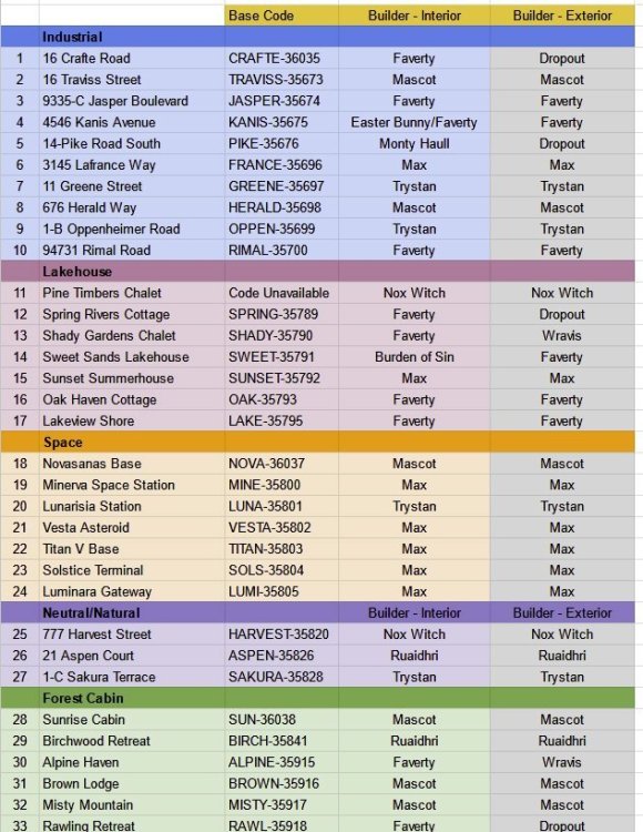 As promised, here's the base code list! Happy exploring! **Raffle Bases** (Tickets are still available.) (Faverty Events offers a raffle ticket for those who cannot afford the ticket price. Please message me if you would like one. No reason or explanation necessary.) HEATHER-32873 PIKE-35676 LAFRANCE-35696 GREENE-35697 OPPEN-35699 SWEET-35791 BIRCH-35841 SUN-36038 COZY-35840 HUDSON-35925 **Base Giveaway** (Register at the auction.) HARVEST-35820 **Do-It-Yourself (Auction)** - new style of base meant for the base editor who can decorate, but not necessarily envision the walls, doors, windows, etc. This base is the structure of 1bed/1bath apartments. LAKE-35836 DOCK-35796 AMAYA-35924 **Auction** ASTEROID-19419 CLOCK-32088 VIGILANTE-29934 KNIGHTSTONE-26623 STATION-37194 HEAVENLY-35785 ATLANTIS-26763 (New addition to the list) VILLA-27300 HOME-38031 HOUSEBOAT-17158 **Dream Home Raffle** (Ticket purchases are closed.) BRAMBLE-37518