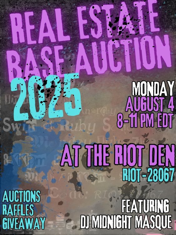 Faverty Events in association with the RIOT DEN will be hosting the 3rd annual REAL ESTATE AUCTION Date: Monday, August 4, 2025 Time: 8pm-11pm EDT EVERLASTING SERVER Base codes will be released August 1, 2025. There will be 10 auction bases, 10 raffle bases, 1 Dream Home Raffle and 1 base giveaway available! Multiple base builders and base owners have signed up to have their bases be a part of the Real Estate Auction. There will be many different styles and themes to choose from! See below on how to sell your base at the auction - registration is still open. Let's get a bunch of players into their new forever homes on the Everlasting server! If you are interested in previewing the available bases, join the Faverty Events discord server and get the updates, extra pictures and details before anyone else! https://discord.gg/wnaHm5nNRB As usual there will be several types of auctions (traditional auction, raffle & giveaway) along with: A DREAM HOME RAFFLE (6 tickets available - 80% proceeds go directly to the base builder/20% to fund other Faverty Events projects.) Do-It-Yourself (Bases with floors, walls, doors, windows, ceilings, door teleports - empty spaces, blank canvases waiting for a builder to fill with furniture and decor to make the space their very own.) Registration for Bases If you are interested in having a base sold at the auction, please contact me on Discord at: domi.sidney_faverty.events or in-game at: @faverty Industries before July 31, 2025. Please join the Faverty Events discord to get more information about selling your base at the Real Estate Auction. Auction, Raffle, Base Giveaway Fine Print: Guests at the auction are expected to follow the RIOT DEN guidelines at all times. Please see the RIOT DEN discord for further information: https://discord.gg/4w9vXYG4Es Guests are expected to bid in good faith. Please refrain from up-bidding if you have no intention of purchasing the base. Guests who win bids are expected to pay the full amount of the winning bid onsite. (Keeping your funds in emails is a good way to ensure you have enough to cover your winning bid.) Guests who bid and do not have enough to cover the cost of the base, will forfeit their win. Any transferred funds will be sent back to the player and the base will be re-auctioned. (A player that needs to transfer funds, may communicate with the deed holder (Sidney-Lynne Faverty) and arrange for extra time, not exceeding 30minutes of real life time.) Winning bidders can expect to have the base transferred to the SG-less character of their choice on site after the total payment has been made. Players may purchase 1 base in the auction. Players who win an additional base in the raffle, or giveaway, may choose the base they want to keep. Funds will not be reimbursed from raffles or other paid events. The base that was not chosen, will become available for purchase in the method it was purchased - ex: if it was won as a raffle, it will return to the raffle pool. It is expected that players purchase/win one base in good faith without entering secondary accounts. Players who have privately purchased bases from Faverty Events in the past are eligible to purchase/win a base in the traditional auctions, raffle and base giveaway and are subject to the same restrictions and guidelines as all other attendees. A portion of the proceeds of the auction, raffle and dream home raffle will go to subsidizing base builders and owners who sold bases in the auction below the reserve amount (the reserve amount will not be disclosed) as well as paying any RIOT DEN staff members who volunteer their time during the auction. Influence transactions will be done through trades at the auction; not through in-game emails. Details of the auction are subject to change without notice. It is your responsibility to read the announcements and follow the guidelines. Raffle: Raffle tickets cost 50mil each/5 tickets max per player. An early bird ticket will be issued for pre-purchased tickets before August 3. Send your requested number of tickets with influence payment in-game to @faverty Industries - I will return your email with your raffle numbers and bonus early bird number if you request tickets and pay before the deadline. There will be a limit of 120 tickets issued. Raffle tickets are sold on a first come, first served basis. No tickets will be reserved or held. Players may purchase raffle tickets on the day of the event from 8-9pm EST from the raffle ticket taker - if there are any available left for purchase. Players may only win 1 base in the raffle. (Players may only win/purchase one base - see Auction details for more information.) Raffle tickets are issued to the in-game global account you purchased the tickets with. If you win a raffle base and come on a different account or you gave some tickets to someone else, you/they will need to identify which in-game global name the number is attached to. This is a security measure to ensure only ticket holders are eligible to win raffle bases. If a player wins an additional base in the raffle, their second win will automatically be rejected and the dice will continue to roll until a number without a prior raffle win/base purchase is rolled. The most recent winner decides which base they would like to own. The winner of a raffle roll does not need to be present, however you will be issued a base at the end of the auction from the bases that remain without having a choice. Raffle winners who are absent from the auction and do not respond to the in-game communication (email and global tell) within 3 days of the auction will forfeit their win and the base will be listed in the next auction or base giveaway. Dream Home Raffle (BRAMBLE-37518): TICKETS FOR THIS RAFFLE ARE OFFICIALLY CLOSED. Dream Home Raffle tickets cost 2 billion influence each - 6 tickets available - 1 ticket per purchaser. The base builder receives 80% of the ticket sales. The remainder goes to fund future Faverty Events projects. Send 