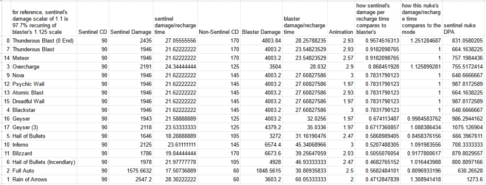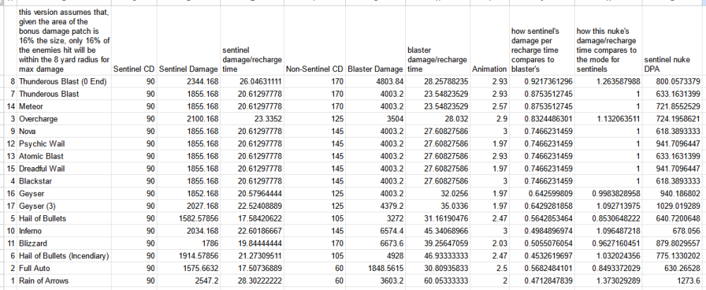 Despite having a longer cooldown than the Blaster version, they both deal MUCH less damage. The full auto cone is also half the size. While I get that Sentinel nukes are supposed to hit less targets, having a longer cooldown, hitting for only 80% of the damage per tick, not having the burst of full auto damage at the end, and having a cone half as long (a QUARTER the total area!) means that the Sentinel version is absurdly weak. While less egregious, Sentinel Rain of Arrows does still have a longer cooldown while only doing 80% of the damage, rather than the 97% we'd expect if they had the same cooldown. Given the Sentinel version is a LONGER recharge, shouldn't it be stronger as a result? That said, Blaster Full Auto appears to be coded to still only hit 10 targets, and Sentinel Rain of Arrows appears to hit 16, so I have no idea if that's influencing things here. Even accounting for that, it means that Full Auto and Rain of Arrows are disastrously weak for Sentinels. The standard for Sentinels appears to be having a damage-per-recharge on their nukes about 1.25 times that of Blasters, though it varies quite dramatically. (Presumably because the burst damage is highly valued for its ability to end fights quickly more than slightly higher sustain, but I don't know for sure.) Attached is a spreadsheet showing a comparison of Blaster vs Sentinel nuke numbers (the Storm Blast ones are likely incorrect; this was calculated when I didn't know about the internal lightning cooldown and was based on the assumption that you'd have a chance to trigger it every 1.33 seconds rather than, y'know, 1.17 to 4.) Final column shows how far off the Sentinel is from the Blaster damage-per-cooldown numbers - more favorable than I expected in many areas, but incredibly far behind on the two biggest offenders. While I'd be sad to see Sentinels lose their few edges here, I'd nonetheless prefer it if the playing field was even across the board.