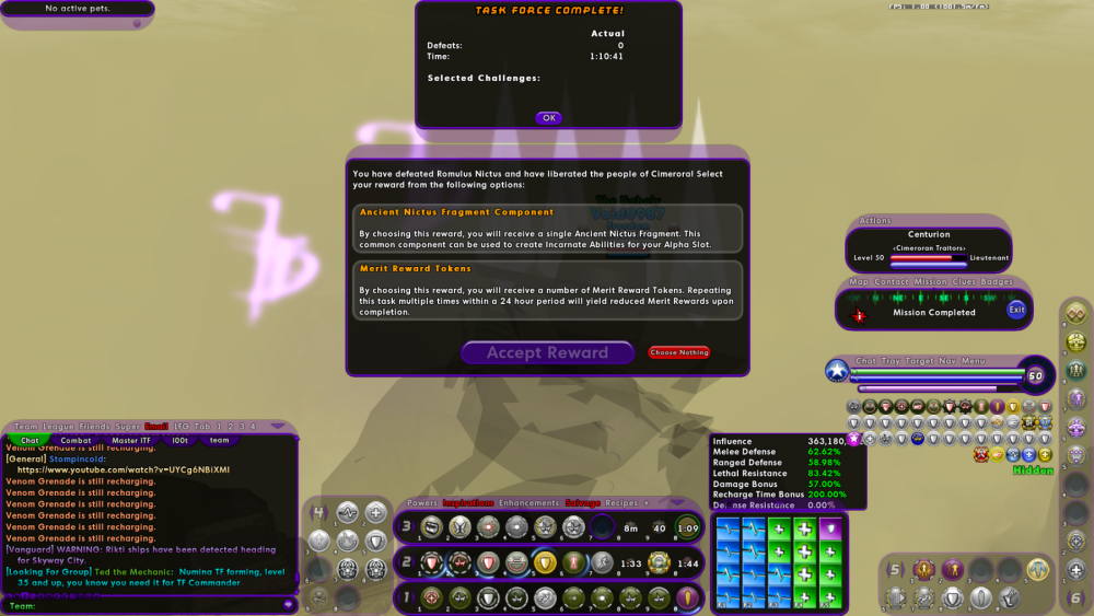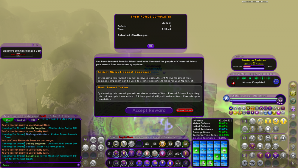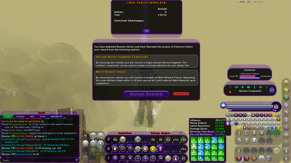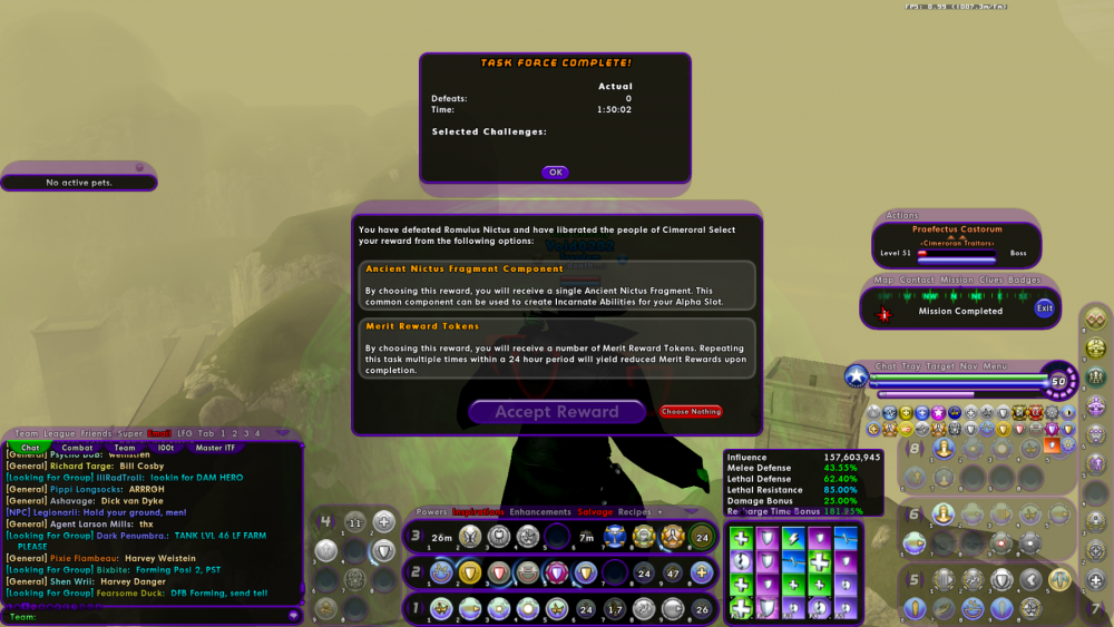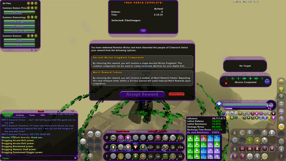 Solo ITF Completion With Mastermind This time, a solo ITF completion with a Mastermind. Demon Summoning/Nature Affinity. Standard +0/X8 settings. Nothing special, because I'm not special. As it turned out, my original plan to use Thugs/Storm fell through once I saw the Demon/Nature build mature. It looked strong. Turns out, it is an extremely durable build, even without using Bodyguard. MM can be tanky by itself, but when it's stacked with Nature, it becomes as durable as a typical Invulnerability tank. Seriously cool. Random, liberal use of some P2W powers to expedite the process, because most MM builds, and especially this one, don't leave room for too many personal attacks. As always, these are clean runs with no deaths tolerated. However, I came as close as ever to getting swarmed a few times, but that durability really helped. So did, at some points, being able to summon and re-summon tons of demons. I did run almost all of the major temp powers (including, at times, the Wedding Band), with the main four accolades in effect, and with all Incarnate powers at Tier 3 (except for Clarion; I kept it at Tier 1). Tactics/Strategy: Directly target the mobs surrounding the chicks on the first map. Upon exiting that map, directly fly up and over to the Sybil and engage the mobs around her. Doing this directly sometimes fools the encounter logic, causing the Kheldian ambush to fail. This time, it didn't, but, even with all demons dead, I easily was able to survive long enough for the altar consultation and pass the level. On the final maps, fly to the AVs immediately, and wipe them out. Kill the auto-hit Nictus first. Then, proceed in reverse to clear the objects. You know the rest of the minutiae here. And, yes, these tactics still fit into the overall strategy. There was a single, very close case of DDR. Had I not been able to fly, I would have been toast. I used Mystic Flight the entire time and remained in hover mode. I paid special attention, especially in the caves, to hover above casual melee contact. Like, at the top of the cave, looking down. There was virtually no down time on button pattern sequencing. All totally smooth the whole run. If you're patient enough, this build can take out virtually anything. The Quest continues... The growing list: ITF Solo 0/8 ITF: Void1001 SD/EM Tanker Void0110 SD/SS Tanker Void2222 FB/INV Sentinel Void9100 DM/SD Scrapper Void7227 RM/SD Brute Void7722 StJ/EnA Stalker Void0777 TM/FB Defender Void 0077 WB/AM Blaster Void3322 FB/TM Corruptor Void9933 PC/PA Dominator Void9998 Arachnos Widow Void0987 Arachnos Soldier Void6661 Mastermind The Build: