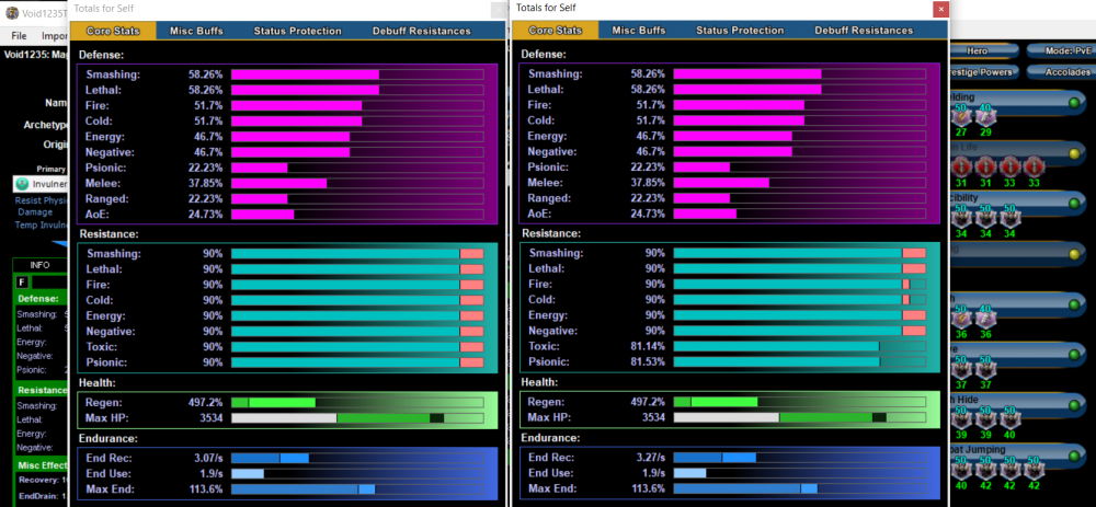 Thank you for the adjustment. This build wasn't designed either for leveling or for exemplary play; however, your adjustment makes it entirely capable of doing such. As for being mathematically unaltered without incorporating Rune of Protection, that is a firm analysis, differentiated only by most subtle parsing in a bit more Status Protection, which is probably redundant, and in an approximate 8% RES in both Toxic and Psionic, for 60 seconds out of 180 seconds (Void's build is on the left): An elegant solution, @Hyperstrike. I very much appreciate both your sharing your knowledge, and your attention to detail. -void