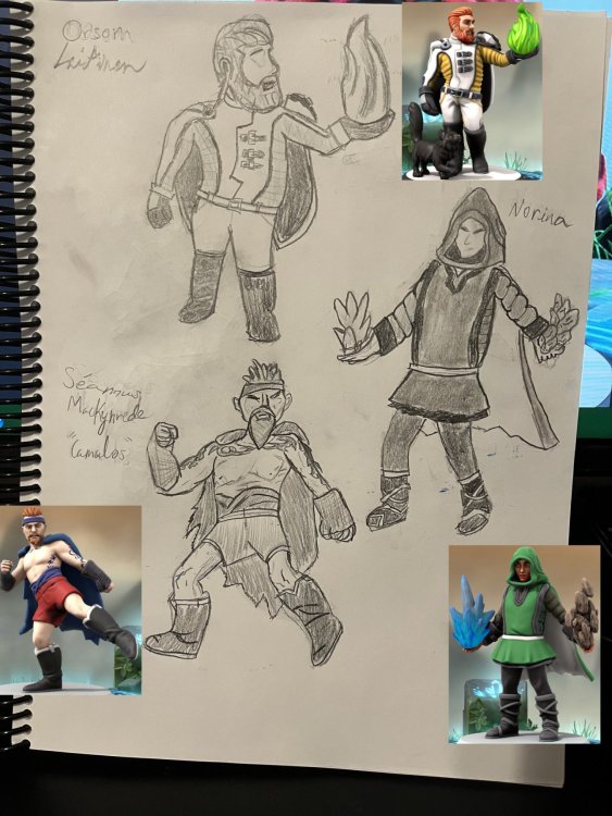 I've been taking a beginning drawing class and it got me sketching out some of my toons. I first created them in Hero Forge and then sketched based off of that; I like the stylized look and the different poses I can get. Presented are: Orson (Thermal/Energy Defender), Norina (Earth/Ice Blaster), and Camalos (Street Justice/Super Reflexes Scrapper)