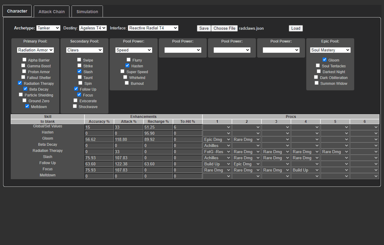 Before anyone gets too excited, I'd say this is at an alpha level stage. I have a lot going on in my personal life right now, so I doubt this will be ready any time soon. I'm trying to make a pylon simulator to make testing ideas easier. It's a lot easier to draw a solid conclusion with 3000 actual runs than a couple times that are subject to a lot of variance. Basically the program right now lets you set up the skills you're using (only care about anything with offensive ability here as I don't model incoming damage), define how you prioritize your attach chain, and then runs a sim to graph a PDF and CDF of the Monte Carlo run. Where I've gotten so far is thanks to @modest, @Bopper and @RubyRed. I think I have most of the basic sets working okay for the melee classes, but don't have data to test yet. By basic I mean ones without power redirect (like Titan Weapons with different animation times) or psuedo pets. I have handled some specific cases of these, but want to rework how I'm doing that to hopefully make it more generic and save me time in the future. I think it's possible basic sets for ranged classes would work fine too. There is something I would love help with to know I'm headed the right direction: data. Specifically, I need actual pylon times for some more sets. I don't have a lot of time to do the coding, so it would be very helpful to farm that out. So far, with Modest's help, we have lined out a Rad/claws tanker (in the gif), Fire/shield scrapper and savage melee/energy aura Stalker. What I'm looking for is this: data from melee ATs (and possibly blaster/defender too) the mids file for the build 10+ pylon times are really needed for me to judge if my results look good or not the only Destiny I have modeled right now is Ageless T4, although I could model lower tiers. If you are using clarion +special for shenanigans, that will have to come later. nothing other than assault hybrid. I strongly prefer if it's left on passive for the runs, because I haven't modeled active Assault yet, but if you already have a set of times with it active, it could be done. If you have the above, you can post it here or I'm happy to talk you on discord at Dismiss#5787. If there is someone interested in helping code this, I'm open to it since it's a lot for one person, but you'd need to be familiar with JavaScript. Warning: I am not a programmer by trade, so if you are and want to help.... I'm sorry, I'm sure there is stuff that is not proper. @UberGuy I've also heard you've updated Ruby's API for the latest versions for your cityofdata site, so I'd love to talk to you about that too.