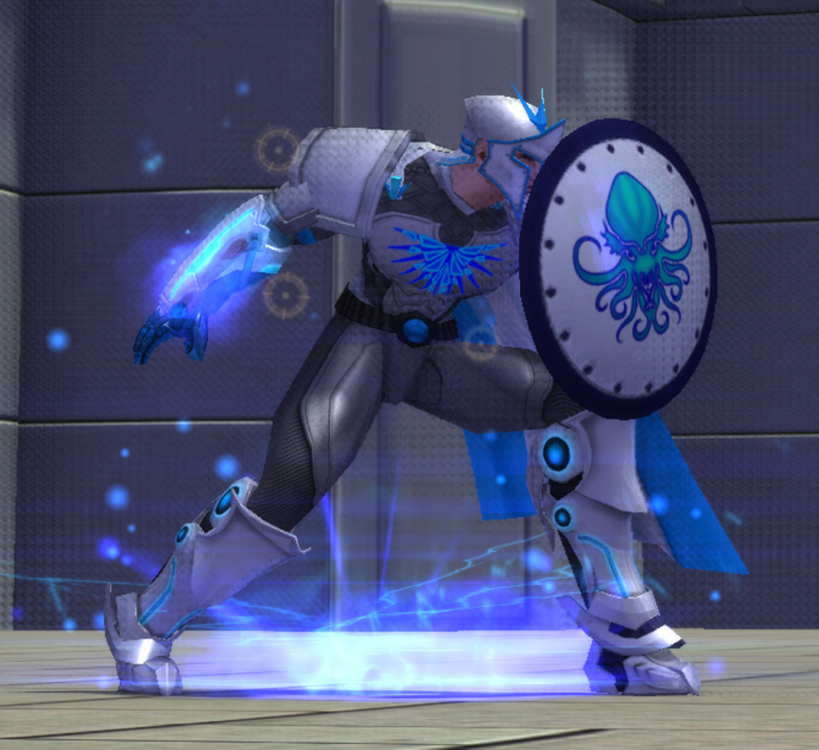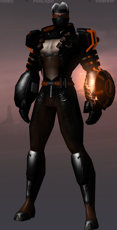 Phaedros - Shield/Elec Tanker. I posted his normal hero costume before, but this was his original time/dimension traveling armor. And this is his latest "Infiltrator Suit" designed by the Vanguard to sneak into and raid Rikkti Hives.