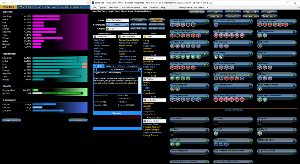 I could not get your build to work for me... too many attacks which it doesn't need, lower res/def than I would like on a tank, and far too much end drain. I also really really (really) don't like granite armor. I'm using it only as a "oh sh*t" button, which I've used exactly once on the way to 50. Here is my build below. My concern even with my build, continues to be endurance. Even with 4.36 rec /1.84 end use... my 4 attack combo takes ~1/3 of my end per combo. So i'm drained after about 4 combos and just have to wait to refill. I took conserve power for that however that's only available for end game content which is annoying. I probably won't take the +rec incarnate either. A build should work properly without having to rely on incarnates. Otherwise, solid build - but always looking for helpful comments to improve it! Thanks.