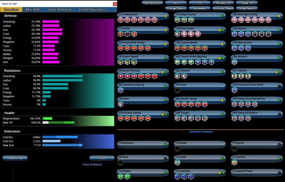 I think I'm spoiled from my fire/em blapper with 1740 HP, both melee and ranged attack chains that never end, with perma high regen/endurance, and can 2 shot purple bosses in melee. Instead my rad/dark is just... unimpressive. Good regen/endurance, but needs a target and a tohit check, which takes away from dealing dmg instead Lots of powers i've ignored since they are are minor pbaoe or attacks that just do dots (on a blaster... why?) -Def attacks, when my tohit is already high since blasters self-buff to-hit anyway -to hit attacks, when on other blasters things are too busy being dead for that to matter. It feel like rad/dark is trying too much to be a debuffing controller. Is that the point? Here's my current build. And yes I stopped taking blaster powers at L30 because sadly there was nothing else that seemed worth getting.
