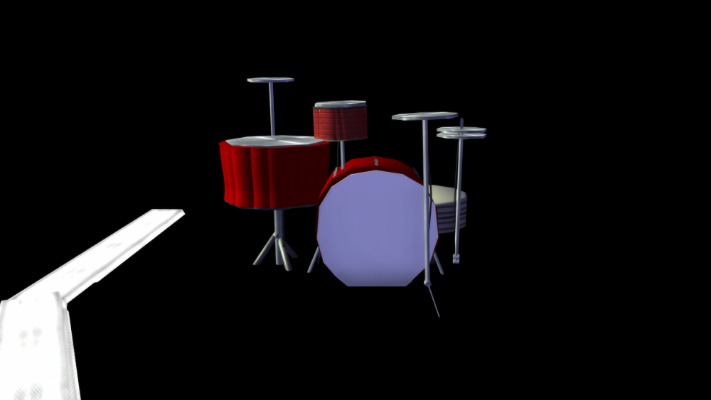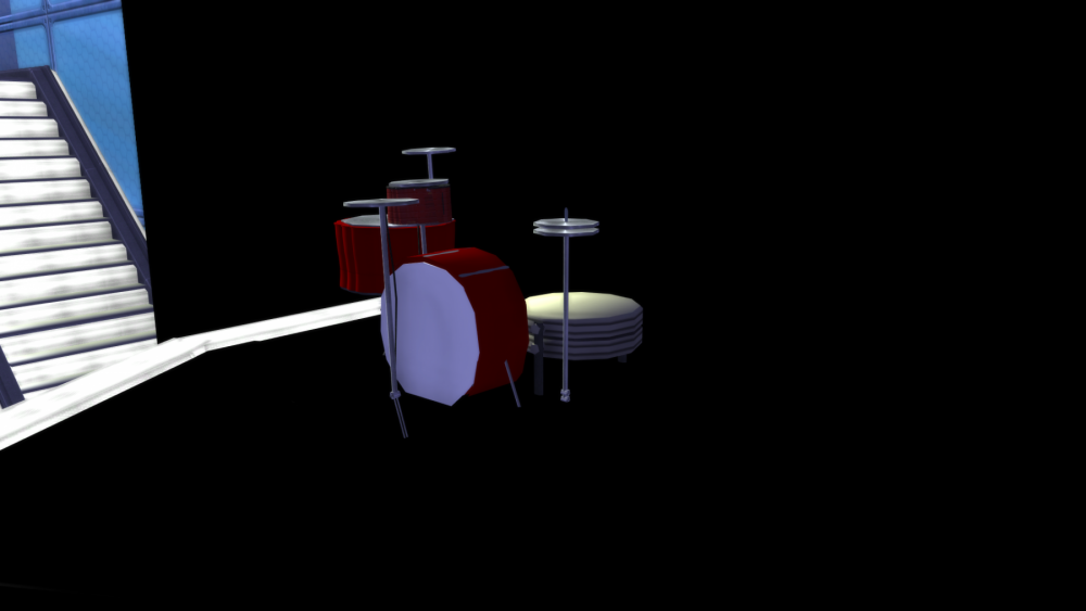 Almost done! Wow, took me way longer than I thought it would, and I still have the second of the smaller perched drums to do, but now that I know how to do it, won't take so long. I changed the color to red because the only thing I could find that didn't shift wildly for the smallest drum was the coffee can, which is red, so, red it is. The larger side drum sides are made from coffee machines. I don't think I will do a colored side for the short wide drum; I have already been thru every tintable item in the editor, and there is nothing that will really work. Pretty much all of the cymbals and drum tops other than the largest drum are made from reading light 1. To get the coffee cans to not bump up above the light stand that serves as the drum surface, I had to set up one light the way I wanted, and then I attached a second light to it using "surface" with no grid setting. Ever notice that when you place items on different surfaces to start with, they end up at slightly different levels when you raise or lower them? Well, I took advantage of that, and it worked. So, I set the coffee cans on the lower, first placed surface and then held control while moving them into position. I had to leave frequently to check to make sure it hadn't shifted past acceptable limits. The short wide drum is two operating lights facing each other, from medical/scientific. And, as I said in my previous post, the largest drum is the top of the number 8 with the center filled in with hyphens and colored 8s slightly shifted to show up around it. And, I just realized that the upside down light stand to the front of the big drum wasn't supposed to be there; it's the stand I used to place the coffee cans. -Dacy