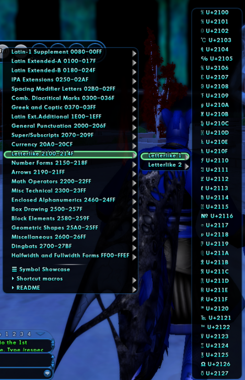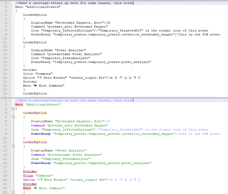 I did some poking around because I wanted to find out how the Fast Travel menu worked and I wanted to share what I learned and my notes. More information about popmenus can be found on this topic and on the wiki. LockedOptions Clickable options with power icons and checking if a power is available. Always greyed out text & always available option. Unicode symbols, spaces, and style. Editing tools. Notepad++ code highlighting. Checking and fixing brackets. Miscellaneous technical notes. LockedOption If you want to create your own clickable powers with like the ones is the Fast Travel menu, it's actually quite simple. Any locked option can have an icon specified, and "PowerReady" can be used to set a certain power's readiness be used as condition of enabling that option. You can get the information for both these things on the excellent City of Data 2.0. NOTE: The correct identifier for a power is how its name appears in the page's URL Icon identifier: You can also find a list of icons on the wiki. Code examples: If LockedOption is given an impossible to fulfill condition like Badge "x" the title of that power is always show as disabled grey text, useful for notes. If on the other hand you don't give the locked option any condition, then the power will always be unlocked but unlike a regular option can have a power icon. Additionally, LockedOption can have multiple conditions, both multiple identifiers of the same type on the same line and both a Badge and PowerReady line. In both cases the option will be enabled if any of its conditions are met. Unicode symbols, spaces, and style There are other things you can do to add to the style and readability of popmenus besides power icons. You can use a not-insignificant selection of special unicode symbols in your popmenus (and macros). You can simply paste any compatible characters into your menu file and they'll display in game. Since font support in game for these extended characters is sporadic and of varying legibility I created a popmenu to display (nearly) every unicode character that the unmodified game can support so you can easily see them in-game. As well as a highlight of some of my favorites. Unicode Systematic.mnu /popmenu UnicodeSystematic All the options are clickable and insert the character into the chat. Another thing worthy of note you may not have noticed/considered is that all spaces in names within popmenus print. You can use this fact to align items in a list that wouldn't otherwise (like icon options and regular options), to left/right align titles, to center align options, and to just create invisible options if you're so inclined. Editing Tools City of Heroes menu files are quite simple so you don't need a full IDE to work with them, but if you haven't already I'd recommend getting something a little more versatile than Microsoft Notepad for your editing. I use Notepad++ for my menu editing so my recommendations are based on that. Code highlighting. I made a NP++ User-Defined Language (UDL) for my own use, it's easy to change and easy to make your own. CoH mnu UDL for Notepad++.xml You can define your own or import mine under Language > User Defined Language > Define your language... Finding bracket errors. If your curly brackets are messed up you can create a screwed up or even game-crashing popmenu. One of the things I used to find and help resolve any bracket errors I might have is the NP++ plugin "BracketsCheck" which you can easily install with the Plugin Admin under the "Plugins" menu at the top. It will locate any unpaired brackets you have, and Ctrl+b will jump you between paired brackets. Any misplaced (duplicated or on a line with anything else but a comment) brackets can be found with a search (ctrl+f) in regular expression mode using this regex ^\h*[{}](?=\h*(\/\/|$))(*SKIP)(*FAIL)|[{}] Demo/Explanation If you make or made a purpose built parser/linter/etc for City of Heroes menus then please share. Miscellaneous technical notes 1. Two (or more presumably) menus can load from a single menu file, just define another menu outside of the paired brackets of your first menu. The second menu doesn't need a blank line or comment between it and the first menu but I think it looks neater. Might be a bad idea, etiquette-wise, if the menus aren't directly related to each other. 2. Regular submenus can't be directly called by commands, only top level menus. 3. Bug, if you call a command to open a second popmenu from inside a submenu it will freeze your character in place until you restart the game, so just put any commands to open another menu in the main portion of your first menu. 4. Fullwidth dollar signs (U+FF04) look better than regular dollar signs.