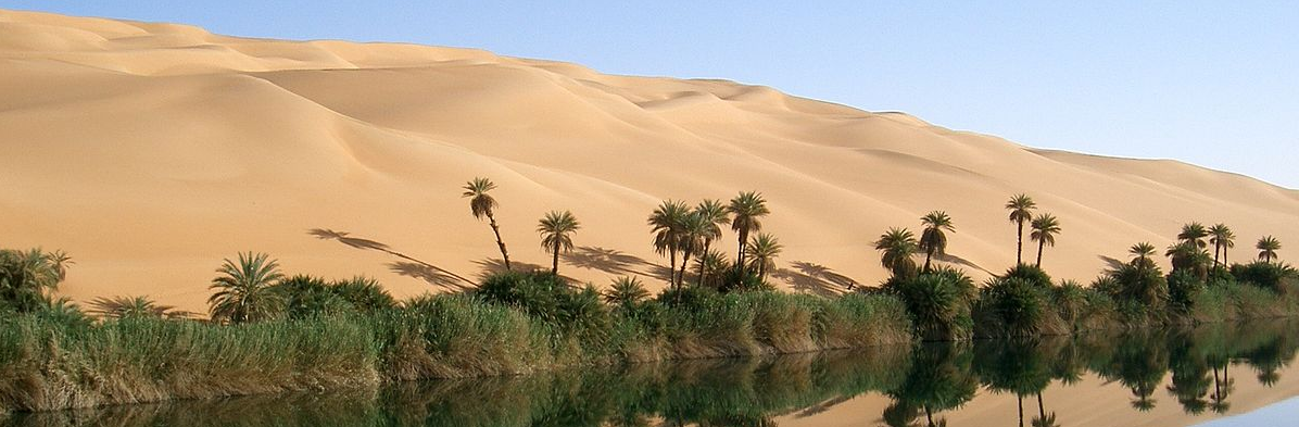 Desert with dunes encompassed by mountainous cave network. -