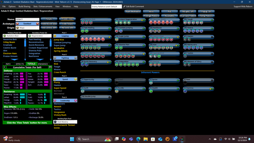 Haven't played Regeneration since live. One of my first characters was a Kat/Regen Scrapper. We all know that the melee Regen is meh. Sentinel Regen seemed like it was better, so I decided to take a run with it. My Rad/Regen Sent just hit 37 and it has actually been pretty fun. I'll admit my other Sent secondaries are stronger, but this was a concept character. Just looking for some Regen feedback. This build is without incarnates. I was trying to get my Sm/Le Resist over 50% (which I just did) and also get my positional defenses over 25% (also a super close cut). I couldn't figure out how to export a link to the build or get my incarnate choices in (my Mids magic is very limited) but this seems solid. Currently, I'm only using basic IOs as I level and it has been fun so far. But I am trying to fashion a good build. I appreciate any feedback. Thanks! Ren